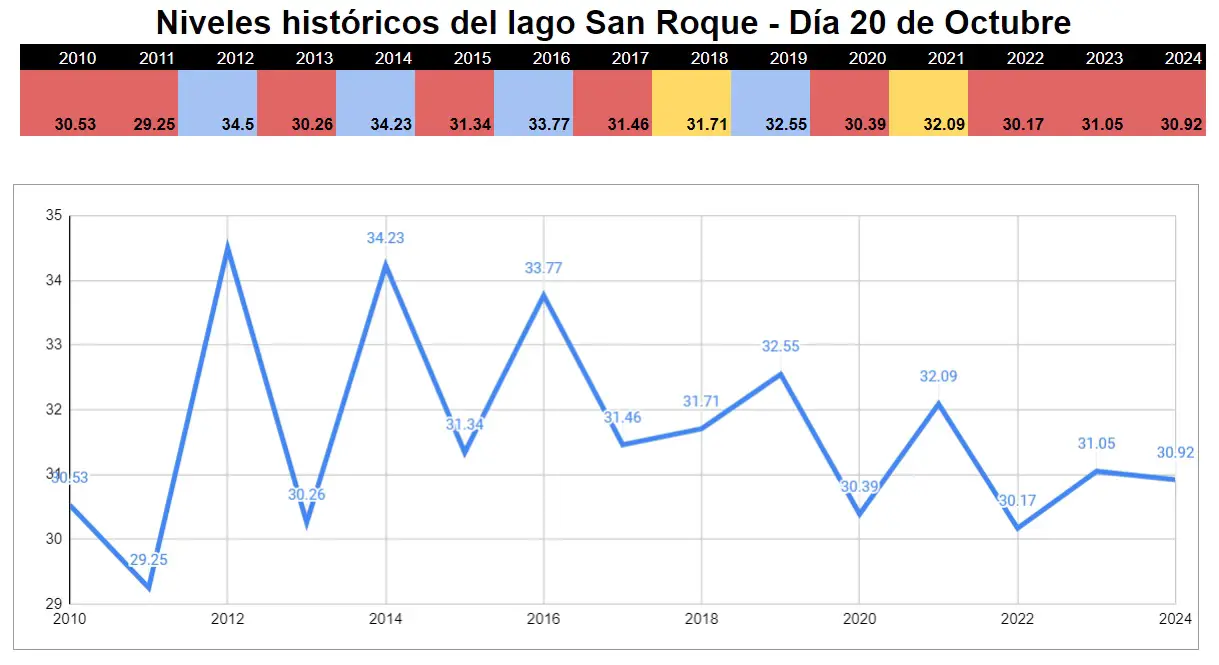 En un análisis histórico de los últimos 15 años, el nivel más bajo registrado para el 20 de octubre fue en 2011, con 29,25 metros, mientras que el máximo se alcanzó en 2012, cuando el lago llegó a los 34,5 metros. Durante este periodo, el promedio se situó en 31,67 metros.