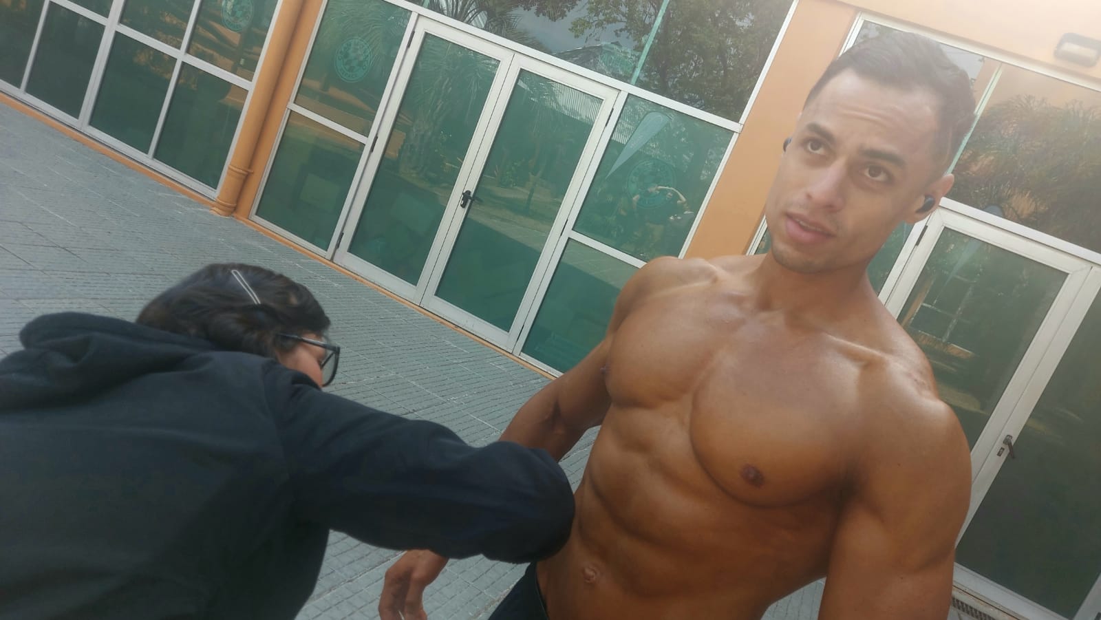 El venezolano de mi foto de hoy, representa a C.A.B.A. y me explica que, por más que se ocupe y preocupe todo el año por su cuerpo… al momento de salir a escena, para pararse ante el jurado con las luces de frente… vale mucho tembién el ‘laburo’ de su compañera maquilladora.
