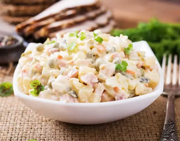 Entre sus ingredientes, incluía carne de perdiz, lengua de ternera, carne de cangrejo, caviar, lechuga, pepinillos, patatas cocidas y aceitunas, y estaba aliñada con una salsa similar a la mayonesa que contenía algún que otro ingrediente secreto que nunca fue desvelado. Muy diferente a la versión que conocemos hoy con papas y arvejas.