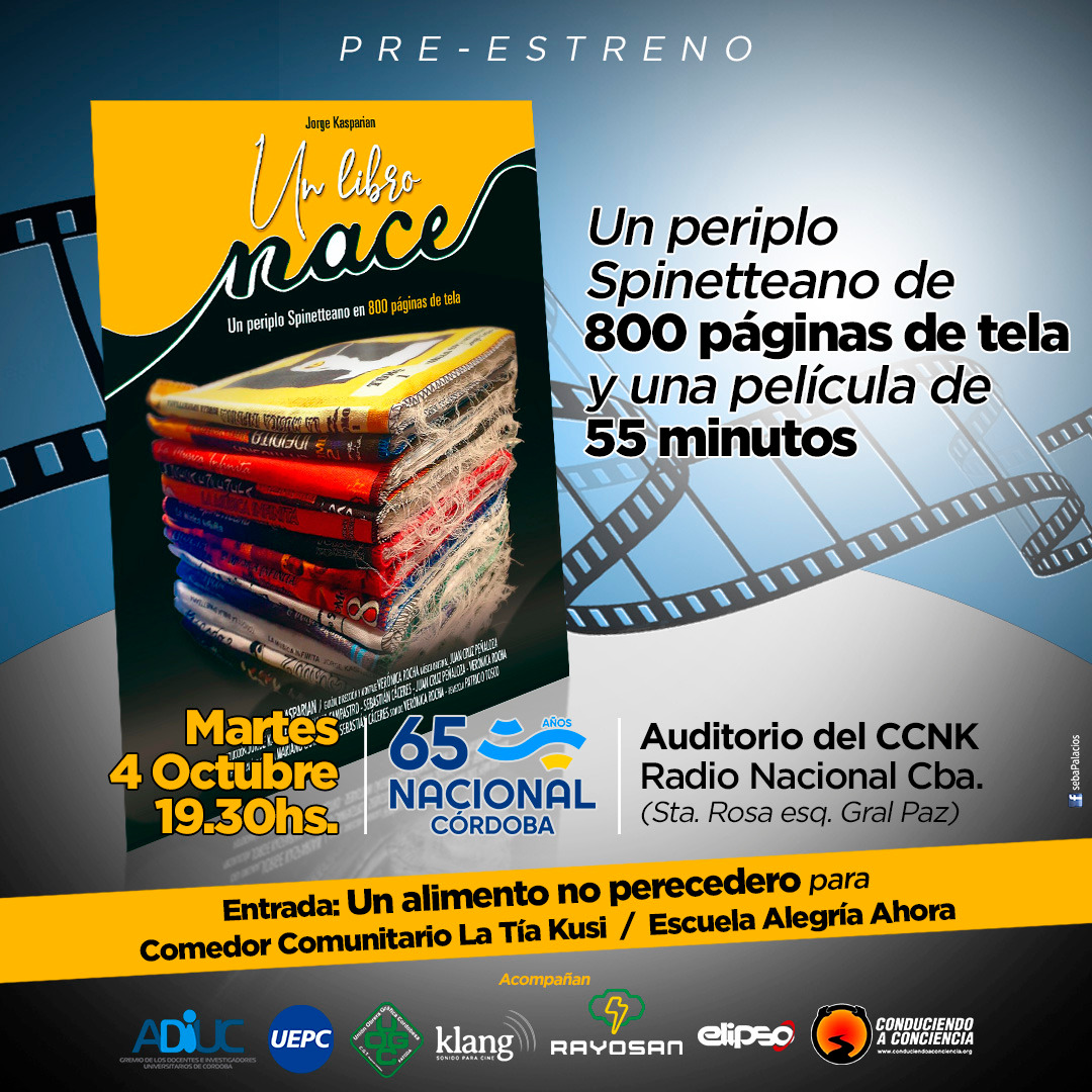 Este martes, Jorge presenta en el remozado auditorio de Radio Nacional, bajo la batuta de mi tocayo Luis Zanetti, un documental sobre “La Biblia Spinetteana”. Allí se cuenta con detalles de lujo cómo hizo para generar un libro estampado en tela, con más de 4kg. de peso (específico), 14 volúmenes, mas de 800 ‘páginas’ (por así decirlo)… y con ‘trabajo’ (habría que redefinir esta palabra) de más de 150 ‘guasos y chichises’… que escribieron, diagramaron… diseñaron… estamparon…