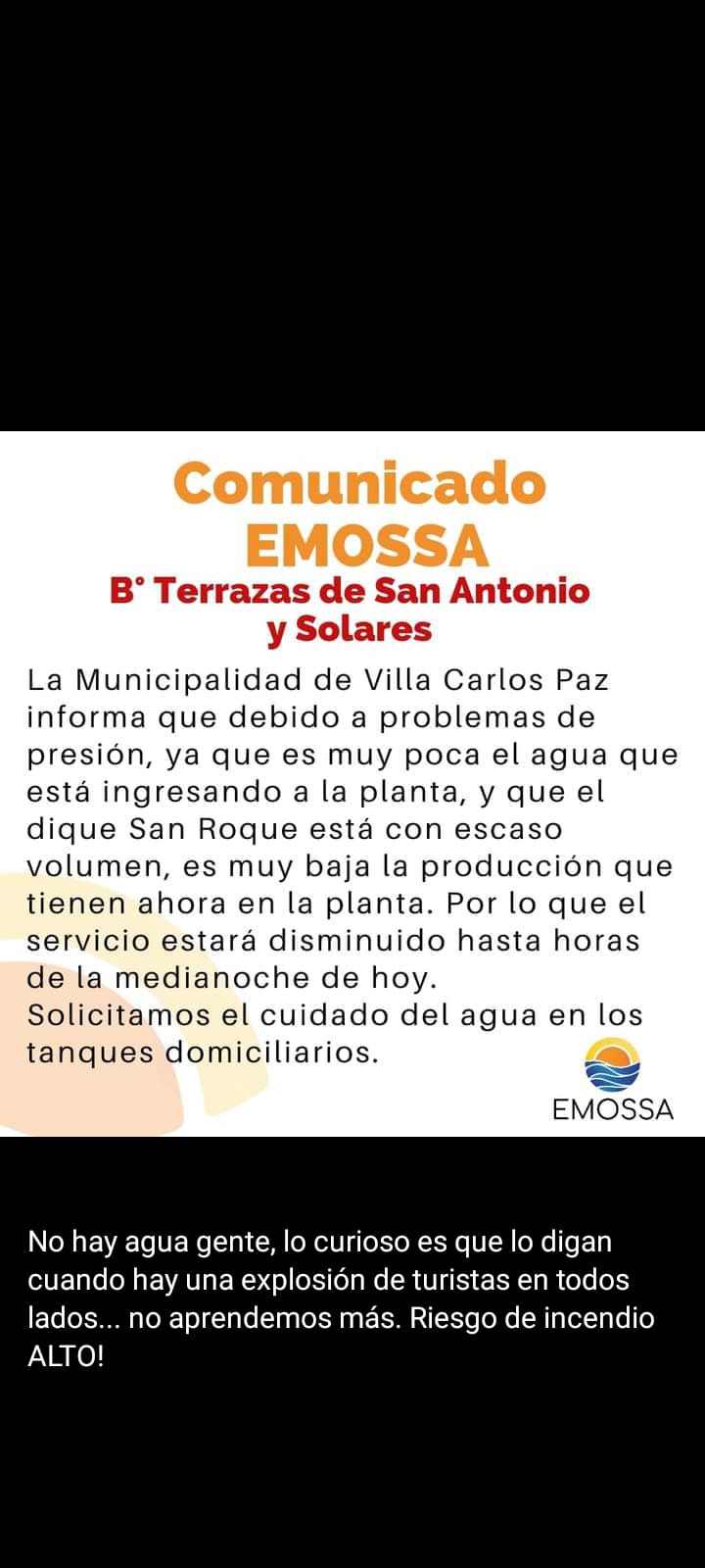 En tanto, en San Antonio de Arredondo, la entidad que presta el servicio, EMOSS, advirtió en un comunicado que el municipio de Carlos Paz les había informado que era muy bajo el nivel de captación del recurso en la planta de Cuesta Blanca por lo que se hace necesario el cuidado del recurso.