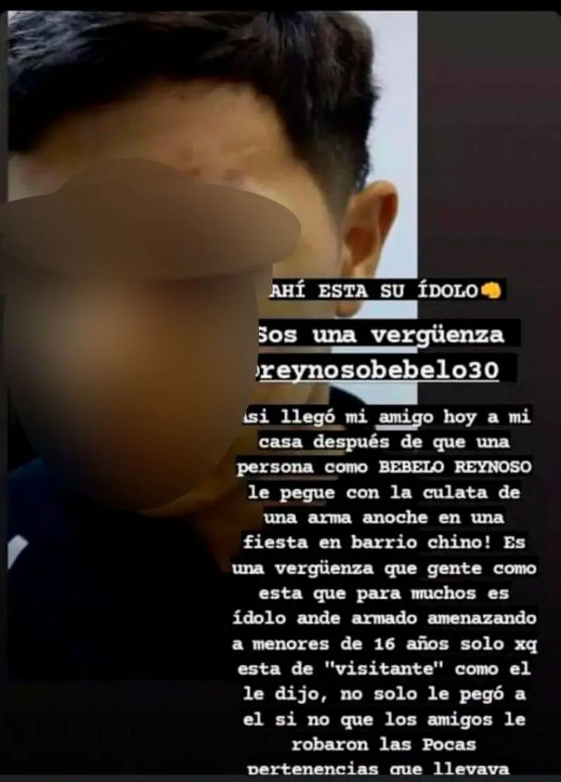 A través de las redes sociales, un amigo del menor de edad publicó una foto de las lesiones y un mensaje dirigido a Reynoso: “Es una vergüenza que gente como esta, que para muchos es un ídolo, ande armado amenazando a menores de 16 años solo porque está de ‘visitante’, como él le dijo. No solo le pegó a él, sino que los amigos le robaron las pocas pertenencias que llevaba”.