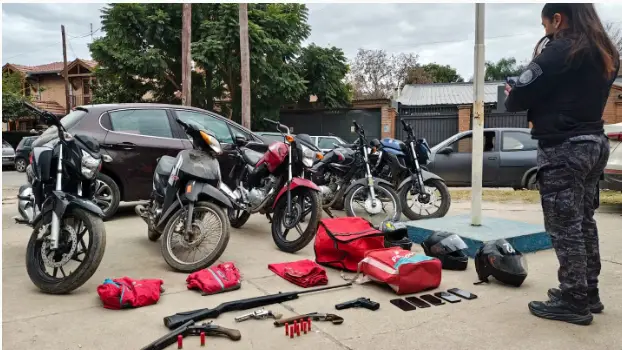 Durante los allanamientos, se incautaron importantes elementos relacionados con la actividad delictiva: cinco motocicletas; un vehículo Peugeot 208 con pedido judicial vigente, tres armas de fuego (dos escopetas y un revólver), seis teléfonos celulares; mochilas térmicas, ropa identificatoria de aplicaciones de envío y otros elementos de interés para la causa.