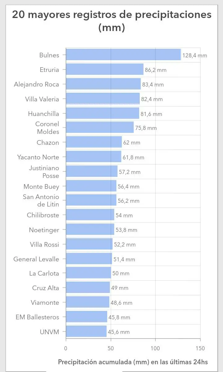 Luego siguen Villa Valeria (82,4 mm), Huanchilla (81,6 mm) y Coronel Moldes (75,8 mm).
