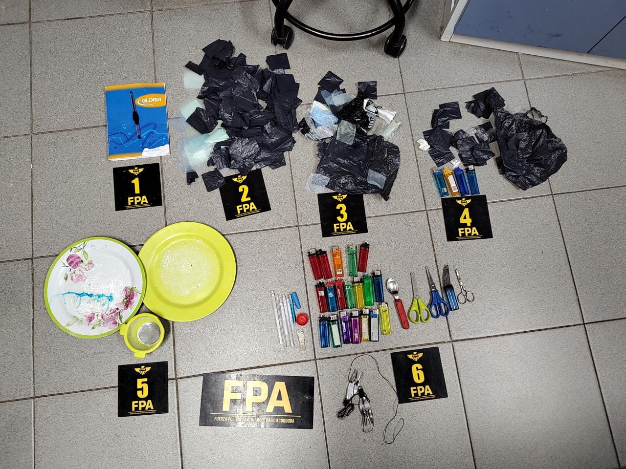 Inmediatamente efectuaron dos allanamientos más en dos celdas de la cárcel de Cruz del Eje donde permanecían alojados familiares de las detenidas. Allí incautaron varias dosis de marihuana, dinero, gran cantidad de recortes utilizados para el armado de los envoltorios de estupefacientes y varios elementos con restos de cocaína. Posteriormente, en una canaleta del pabellón de la cárcel hallaron una importante cantidad de cocaína, informaron desde la Fuerza.
