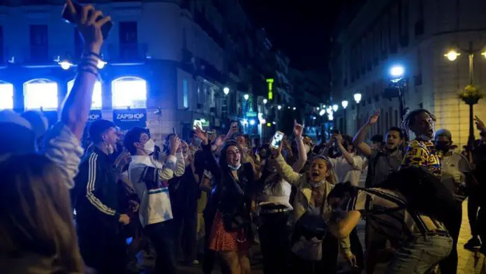 Si bien en Madrid y otras ciudades, como la sureña Sevilla, no hubo incidentes destacables, imágenes de los festejos mostraron el descontrol y el incumplimiento de las medidas contra el virus.