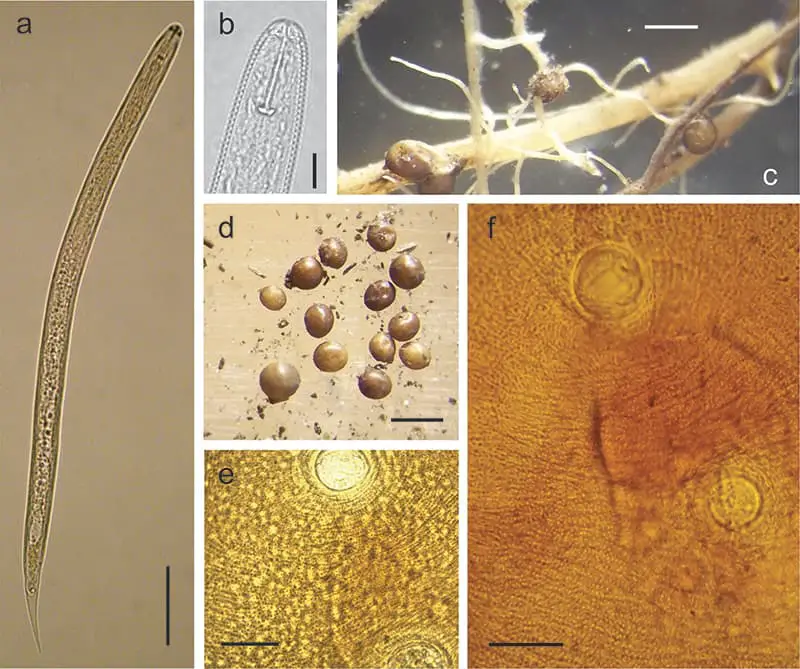Mientras la hembra está viva es de color blanco o amarillento, pero cuando muere se torna marrón, la pared de su cuerpo se hace más resistente y se transforma en un quiste que en su interior puede contener entre 200 y 300 huevos. El quiste luego se desprende de la raíz y queda en el suelo.