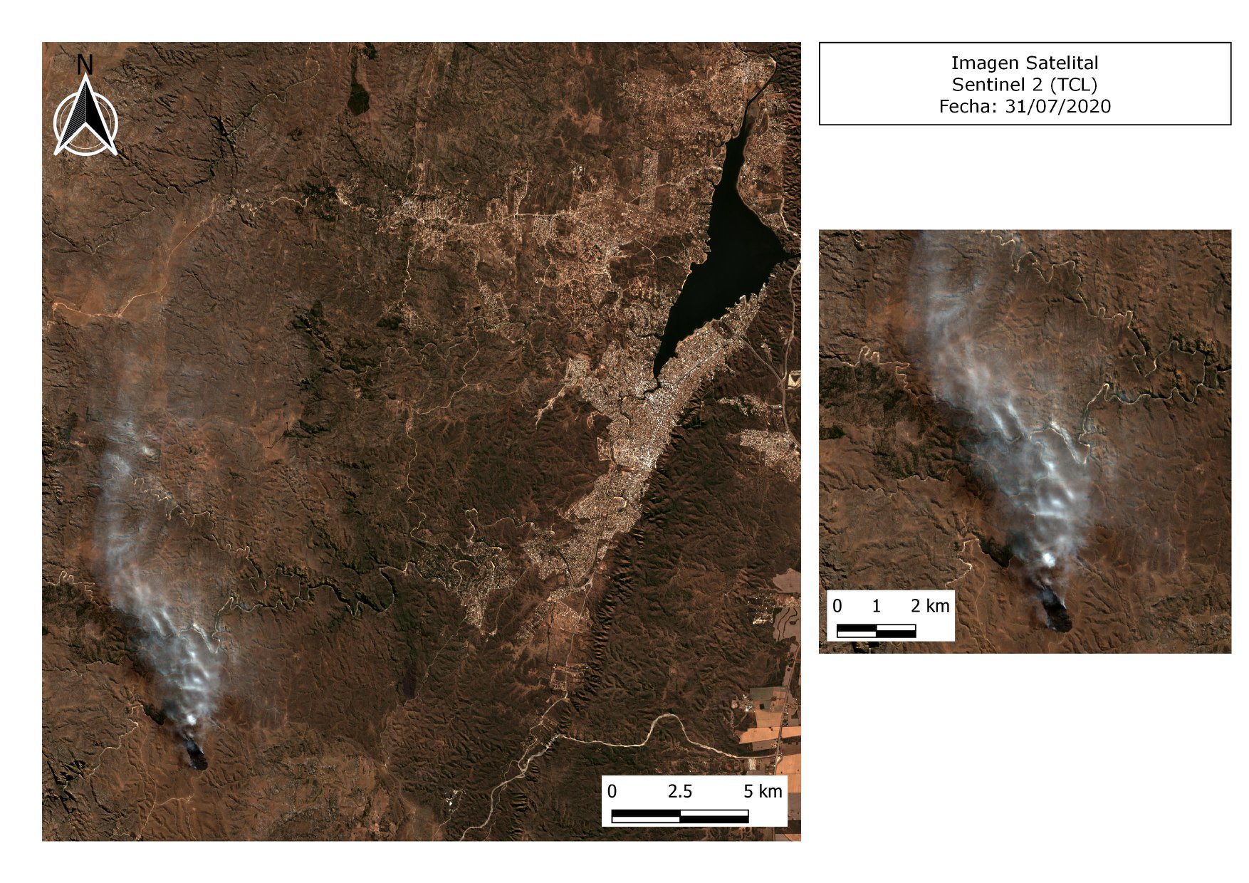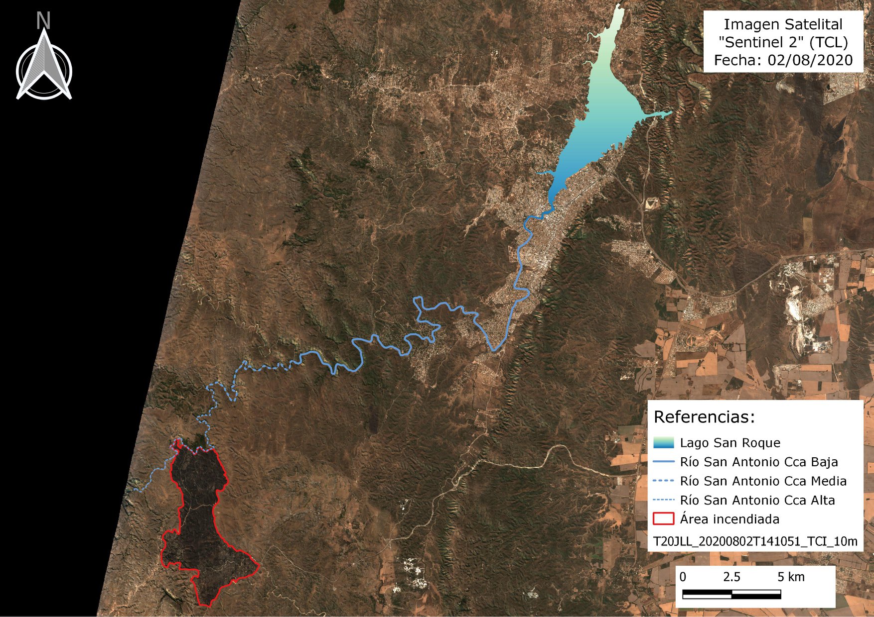 La recopilación realizada por la Dirección de Ambiente de Villa Carlos Paz muestra que el área afectada representa una superficie mayor a la que tiene el lago San Roque (1639 ha) como puede apreciarse en las fotografías del satélite Sentinel 2, tomadas el pasado 2 de agosto.