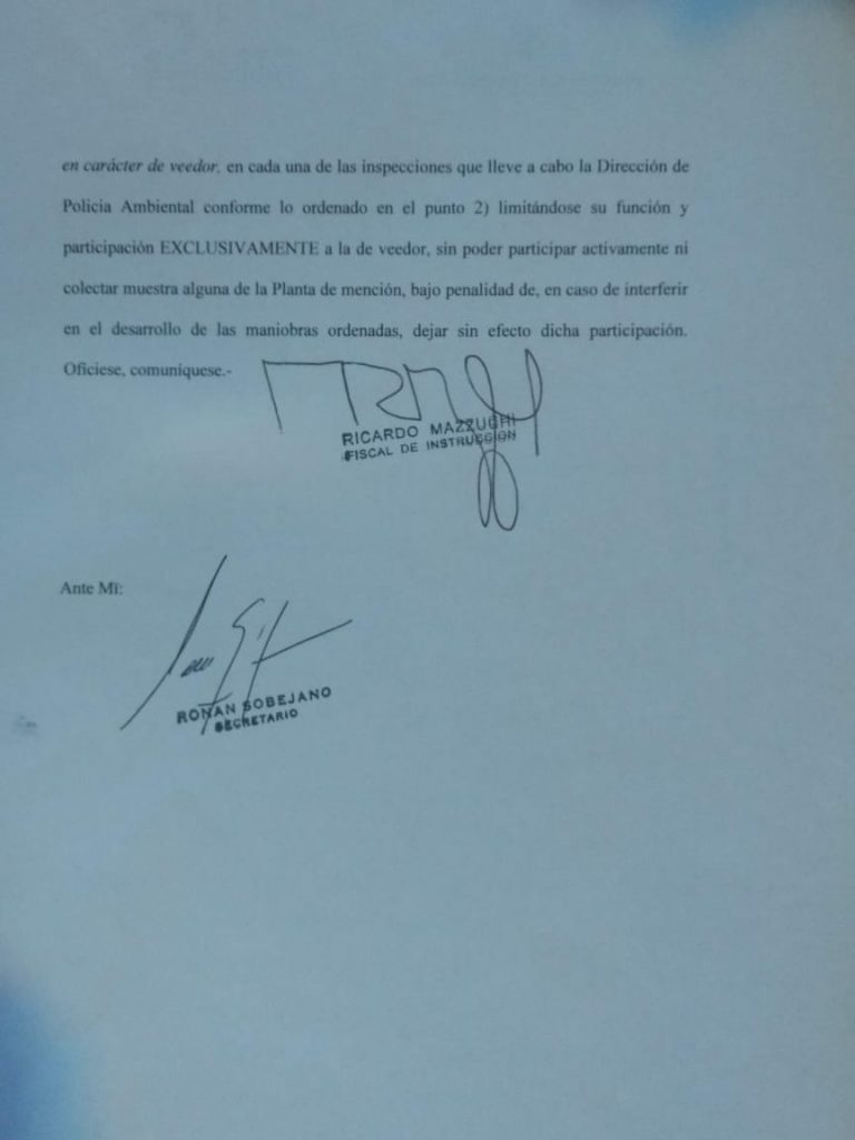 Asimismo, en la resolución inciso 3 del mismo texto, se especifica: “A la solicitud de participación municipal en el control respecto al funcionamiento de la Planta depuradora de residuos cloacales, ha lugar, solo en carácter de veedor en cada una de las inspecciones que lleve a cabo la Dirección de Policía Ambiental, (…) limitándose su función y participación EXCLUSIVAMENTE  a la de veedor, sin poder participar activamente ni colectar muestra alguna”.
