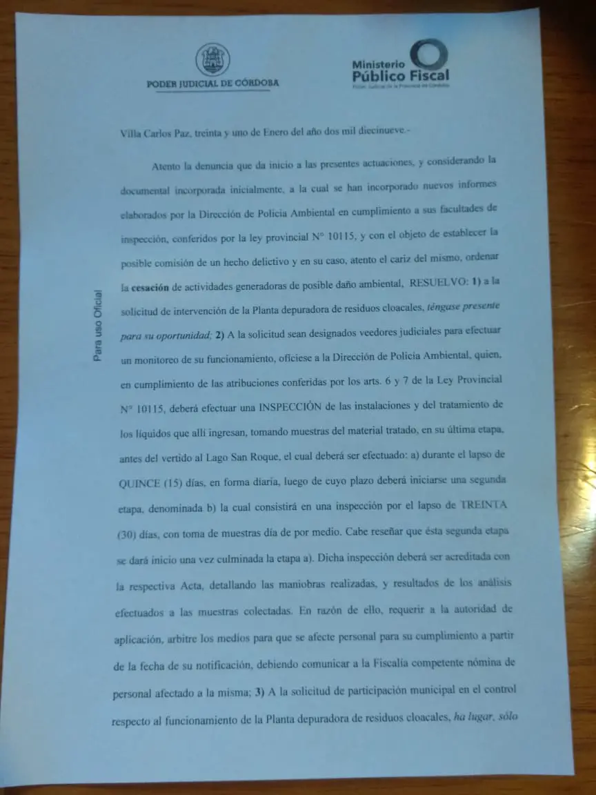 Sobre este último punto, el dictamen señala en la resolución inciso 2: “A la solicitud sean designados veedores judiciales para efectuar un monitoreo de su funcionamiento, ofíciese a la Dirección de Policía Ambiental, quién (…) deberá efectuar una INSPECCIÓN de las instalaciones y del tratamiento de los líquidos que allí ingresan, tomando muestras del material tratado, en su última etapa, antes del vertido al Lago San Roque, el cual deberá ser efectuado: a) durante el lapso de QUINCE (15) días, en forma diaria, luego de cuyo plazo deberá iniciarse una segunda etapa, denominada b) La cual consistirá en una inspección por el lapso de TREINTA (30) días, con toma de muestras día de por medio. Cabe reseñar que esta segunda etapa se dará inicio una vez culminada la etapa”.
