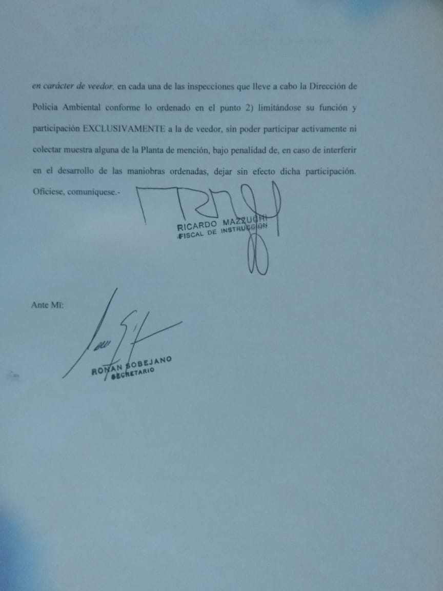 Asimismo, en la resolución inciso 3 del mismo texto, se especifica: “A la solicitud de participación municipal en el control respecto al funcionamiento de la Planta depuradora de residuos cloacales, ha lugar, solo en carácter de veedor en cada una de las inspecciones que lleve a cabo la Dirección de Policía Ambiental, (…) limitándose su función y participación EXCLUSIVAMENTE  a la de veedor, sin poder participar activamente ni colectar muestra alguna”.