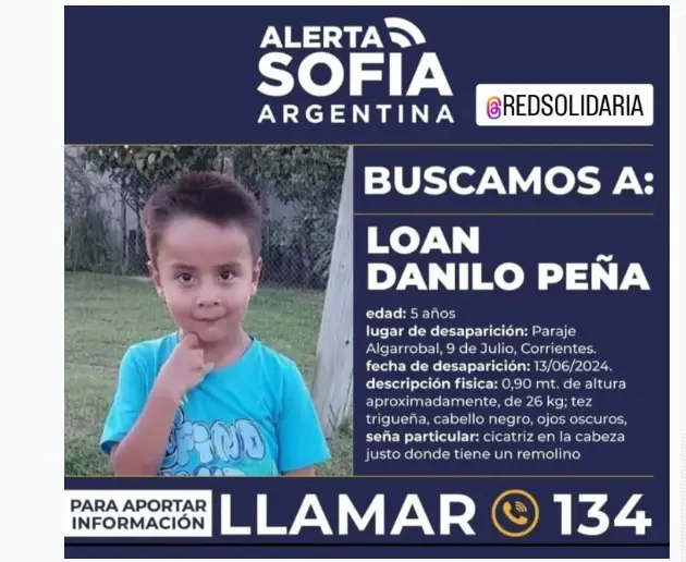 Según informa TN, Loan Danilo Peña, de cinco años, desapareció este jueves en un paraje rural de Corrientes. Por el riesgo inminente, el ministerio de Seguridad de la Nación activó el programa Alerta Sofía, que dura 24 horas y apunta a difundir masivamente la imagen del chico para encontrarlo.