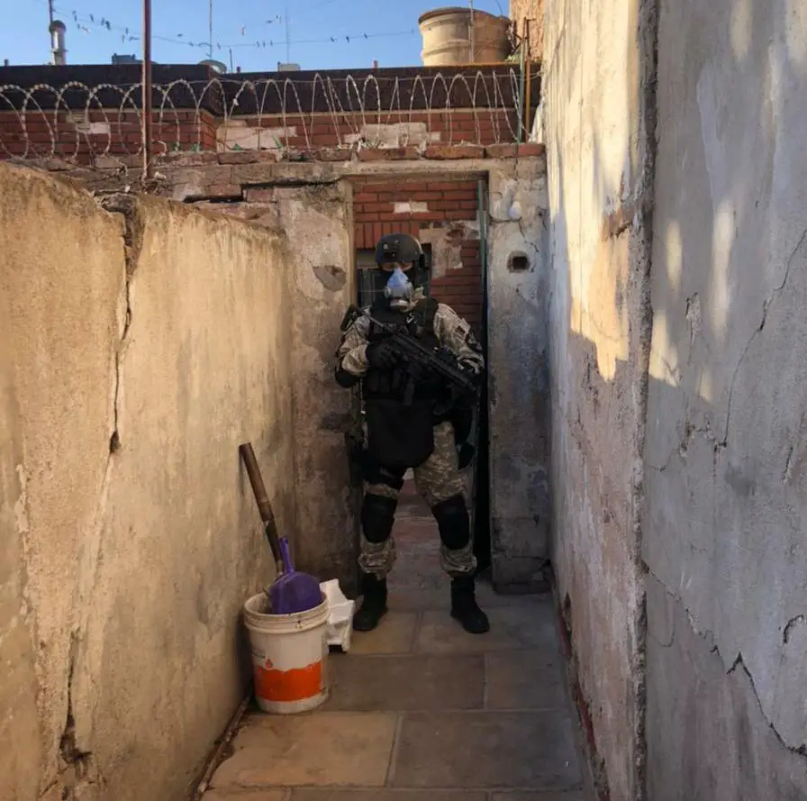 El equipo táctico de la FPA realizó la irrupción en un domicilio ubicado en calle Perú s/n de barrio Güemes, donde lograron decomisar varias dosis de cocaína, marihuana, dinero en efectivo, un arma de fuego, munición y elementos que estarían relacionados al fraccionamiento y comercialización de sustancias ilícitas.