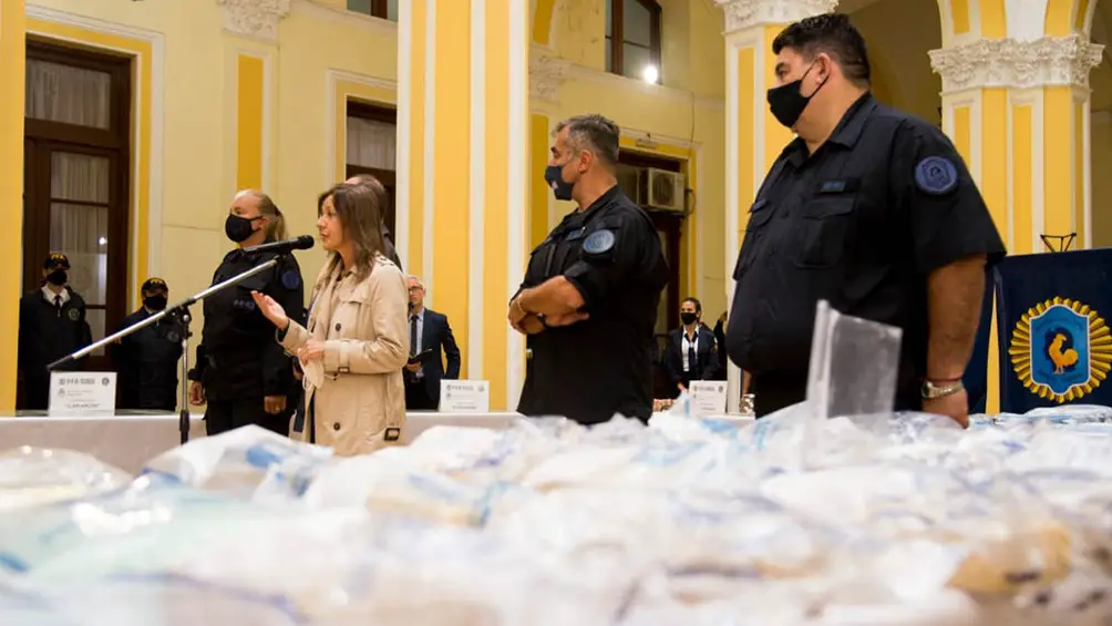 La ministra de Seguridad de la Nación, Sabina Frederic, aseguró en la mañana del lunes en una conferencia de prensa realizada en el Departamento Central de la PFA que «se consiguió desbaratar un eslabón intermedio de una cadena de tráfico de drogas en el Gran Buenos Aires”.