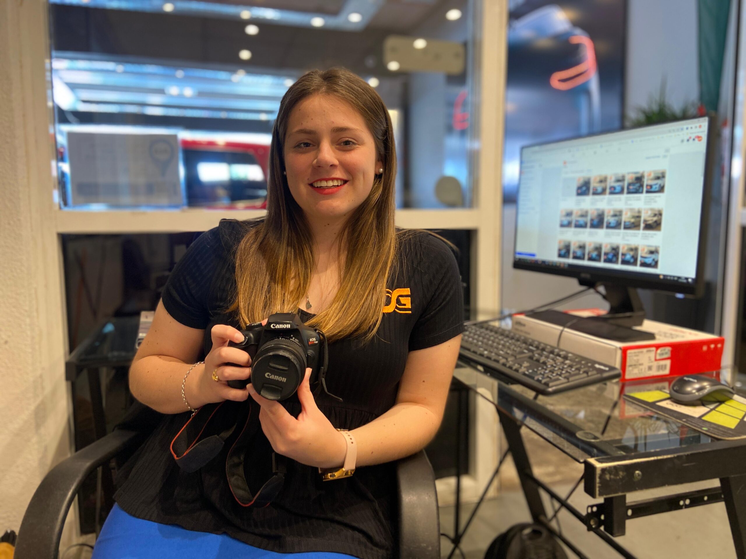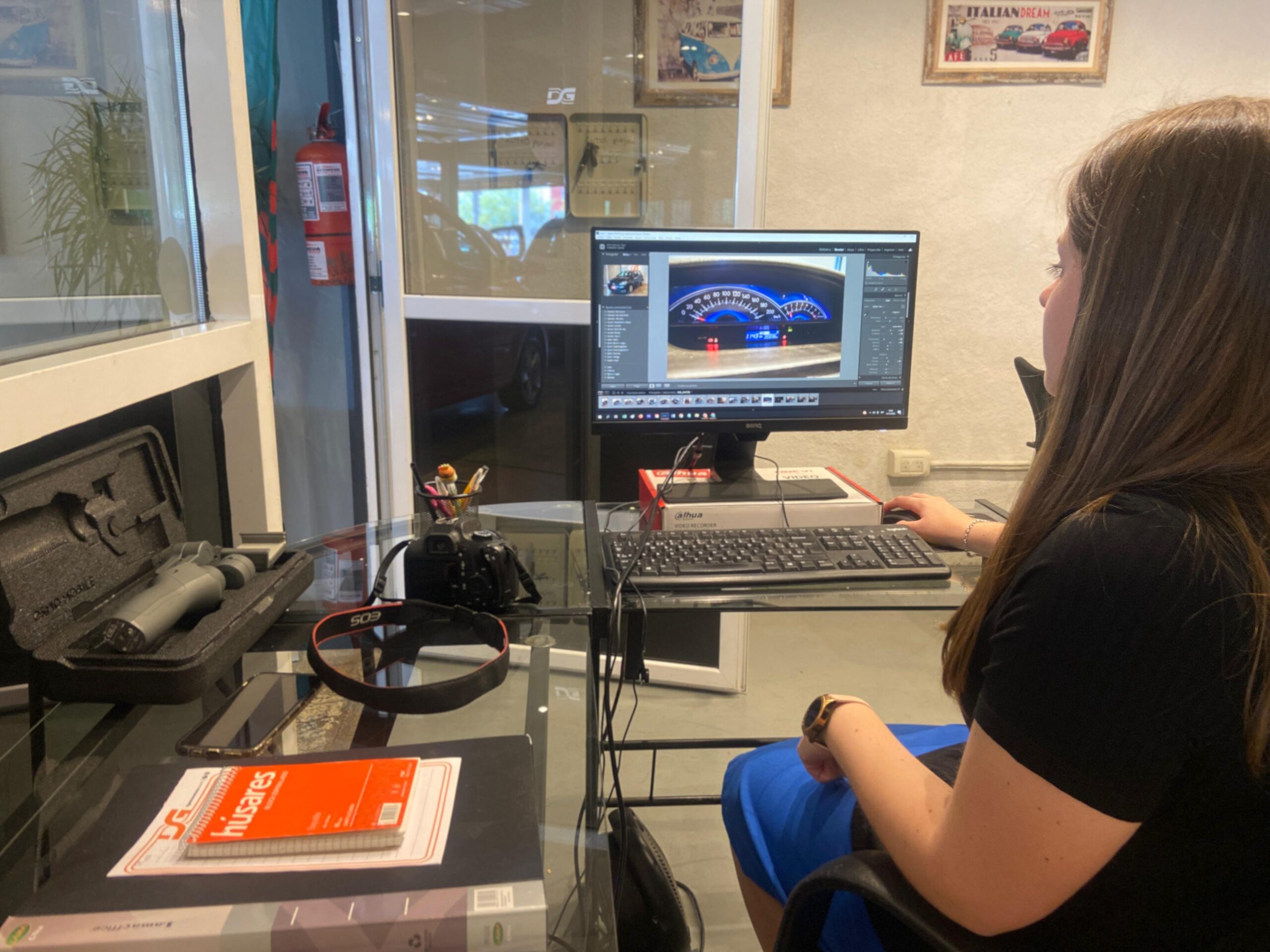 Bianca saca fotos de todos los vehículos que llegan a la empresa, las edita y prepara los diferentes álbumes que luego se publican en la Web de DG y sus redes sociales.