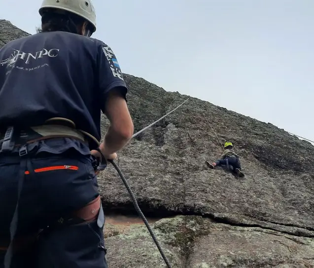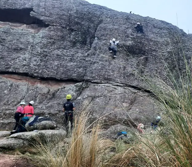 Sin embargo, con la buena energía del grupo y sus dos acompañantes (Matias Vivanco y Diego Molina, expertos en cuerdas y en la seguridad de la actividad principal) el aguacero se detuvo y con un poco de viento la roca se secó, lo que permitió que minutos más tarde, los «monitos» de la profe Pamela Quintela pudiesen escalar, por primera vez, en tres de las más de 500 vías que tienen Los Gigantes, la escuela de escalada más grande del país.