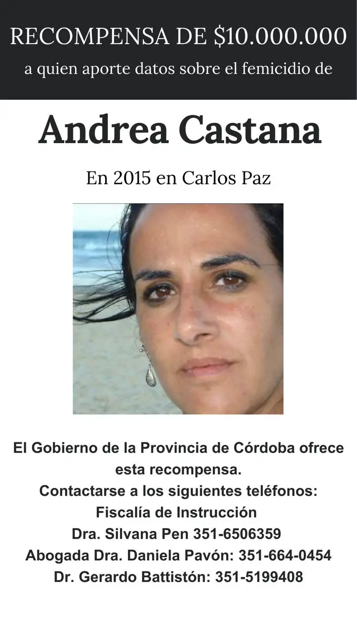 A partir del aval que le dio el Ministerio de Justicia a la causa de Andrea Castana, esta semana comenzó a difundirse la imagen con el nuevo monto de la recompensa que se pagará a quien aporte datos sobre el crimen de la mujer ocurrido en marzo de 2015 en el Cerro de la Cruz de Carlos Paz.