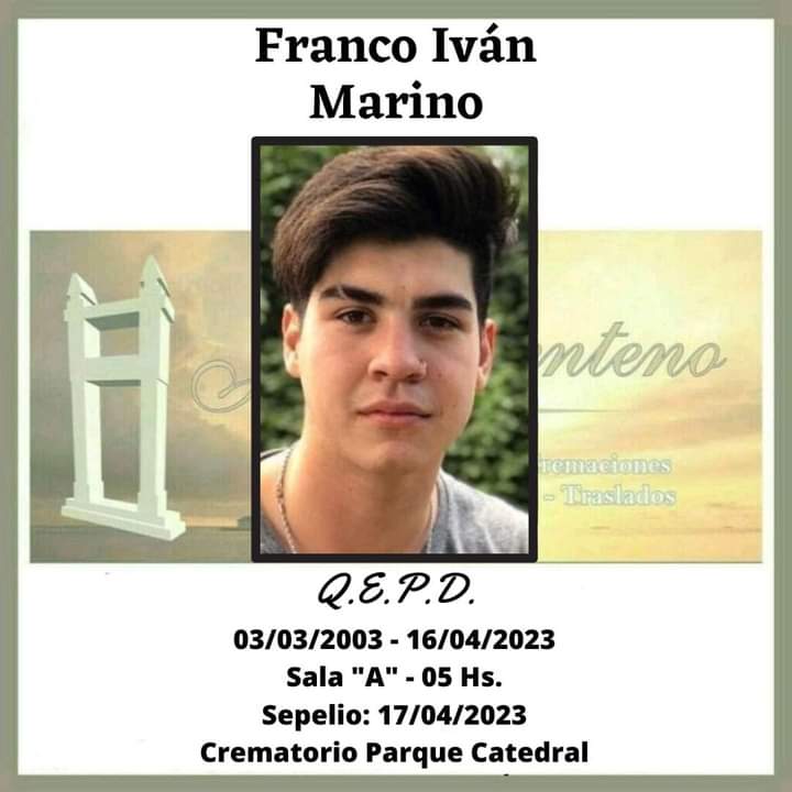 El cuerpo de Franco Marino, el joven atropellado en Carlos Paz por un automovilista, quien falleció este domingo en el Hospital Domingo Funes, es velado durante toda la jornada de este lunes, hasta las 21 hs en la Sala A del Crematorio Parque Catedral , en Av. San Martín 1096, Los Eucaliptos, de la ciudad.