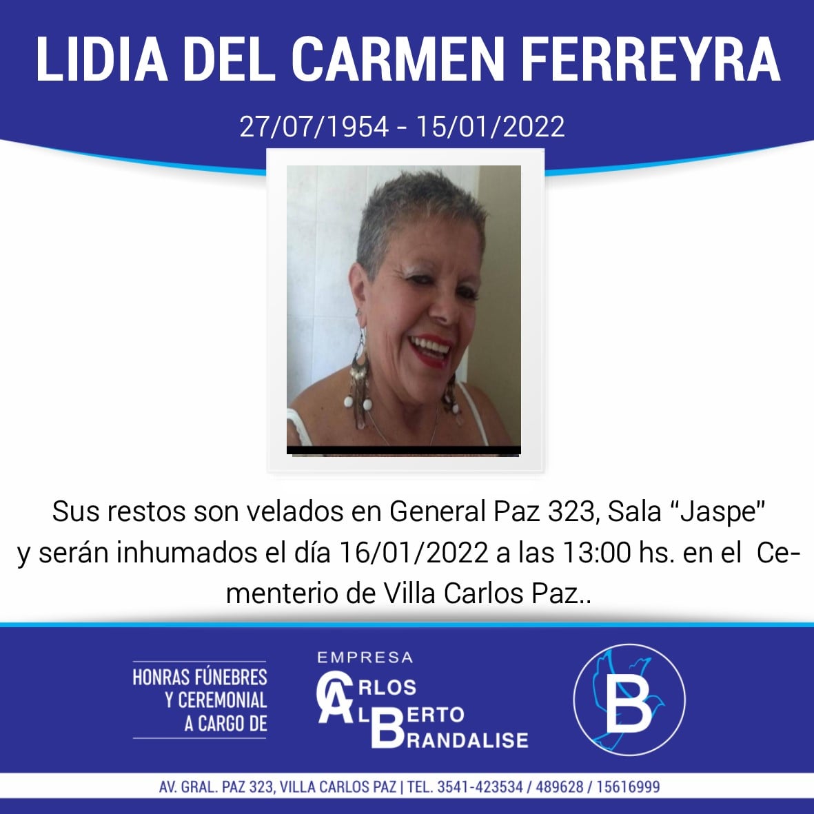 Sus restos son velados en la sala Jaspe de Casa Brandalise y serán inhumados este domingo a las 13 en el cementerio de Villa Carlos Paz.
