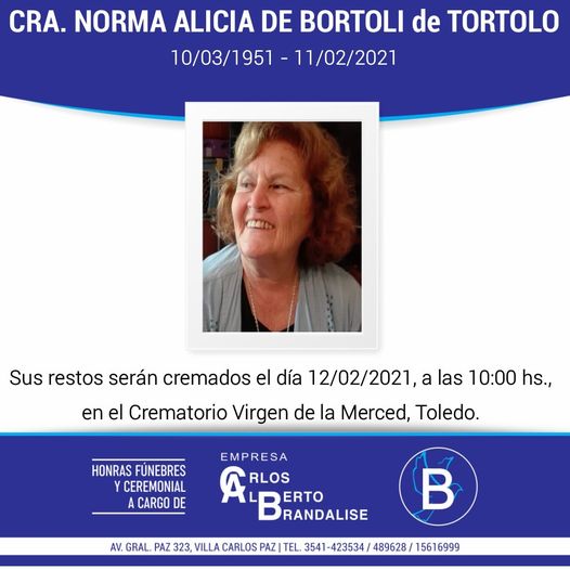 Un profundo dolor causó este jueves por la tarde la noticia de la muerte de Norma Alicia de Bórtoli de Tórtolo, docente y desde hace años representante legal del Instituto Remedios de Escalada de San Martín.