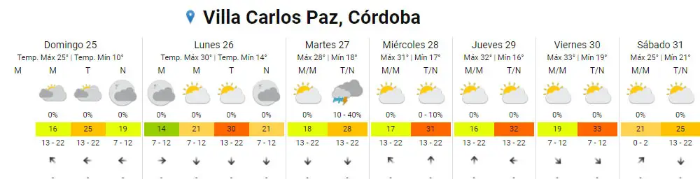 Siempre según el Servicio Meteorológico Nacional, el martes sería el día mas fresco de la semana aunque manteniendo similares condiciones. La mínima será de 18 grados, mientras que la máxima llegaría a los 28. Este es el único día con alguna probabilidad de lluvia por la tarde noche.