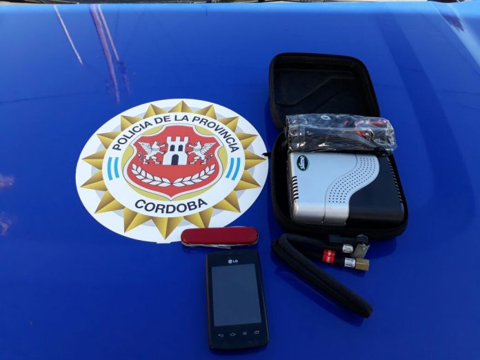Además de los elementos mencionados, la policía les secuestró un compresor de aire portátil y una cortapluma de color roja.