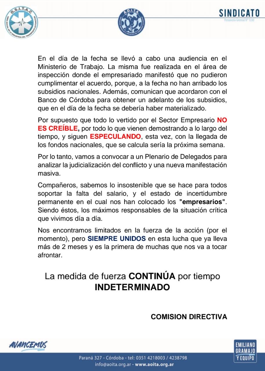 Este viernes se concretó una audiencia en el Ministerio de Trabajo de la Provincia que involucró a todas las partes y no se llegó a un acuerdo. El reclamo tiene que ver con los salarios adeudados y con el cumplimiento del acuerdo cerrado dos semanas atrás en el que los choferes resignaban un 25 por ciento de sus sueldos.