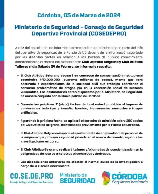 Luego que parte de la hinchada Pirata utilizara diferentes tipos de pirotecnia en el clásico cordobés ante Talleres, el Consejo de Seguridad provincial dictaminó que el club de Alberdi deberá cumplir con varios y costosos puntos.