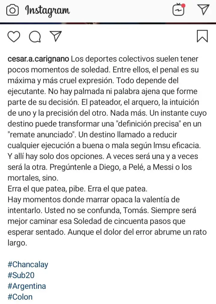 Sin embargo, uno de los ídolos goleadores del club, el cordobés oriundo de Freyre, Cesar Carignano, apoyó al joven delantero en su cuenta de Instagram con la frase: “Erra el que patea, pibe. Erra el que patea”.