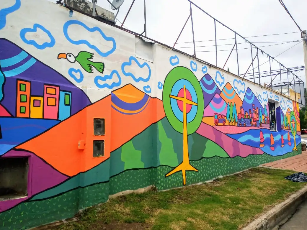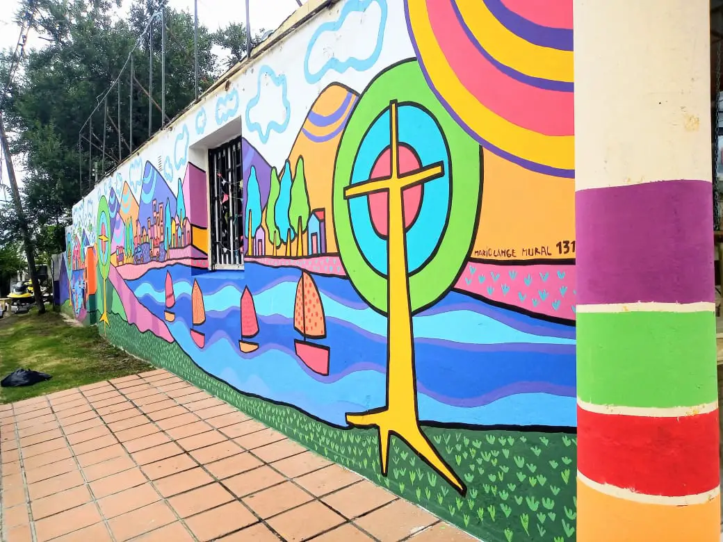 Sus murales se inspiran en los entornos que visita. En el caso del que pintó en nuestra ciudad, hay montañas, ríos, un lago y barcos, entre otras cosas.