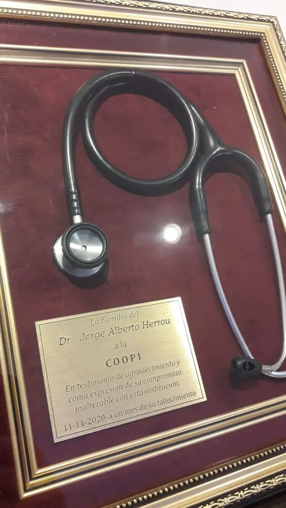 Familiares del ‘Doc Errú’ se hicieron presentes en la sede de la calle Alvear, al lado de la central de la Coopi, y junto con un puñado de dirigentes cooperativos se procedió, en solemne acto, al destape del cartel, a entregas florales, a la entrega encuadrada de su principal herramienta: su estetoscopio, con el que auscultó a tres generaciones de ‘pacientitos’ y a palabras emotivas.