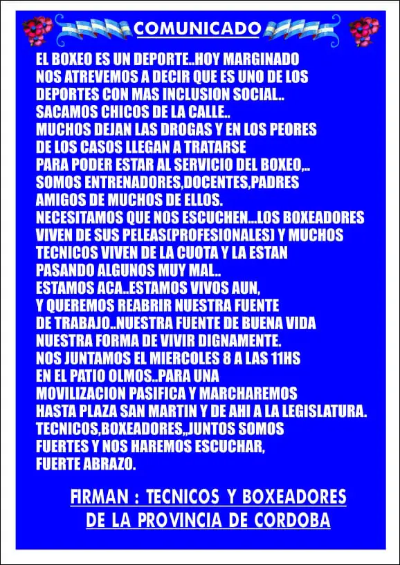 “Nos sentimos discriminados, no es posible que el COE de la Provincia de Córdoba habilite otros deportes de contacto como las Artes Marciales en todas sus variedades y al Boxeo lo deje afuera”, expresa en su comienzo el comunicado difundido por los técnicos y boxeadores cordobeses.