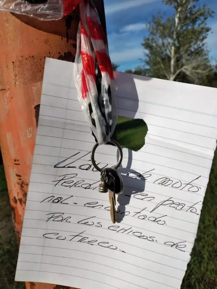 Este jueves por la mañana, un vecino de Villa Carlos Paz salió como todas las mañanas a caminar por la Costanera y se encontró con un cartel escrito a mano, con lapicera, que decía: “Llave de moto perdida en peatonal. Encontrada por los trabajadores de Cotreco”. Junto al cartel, se encontraba colgada la llave en cuestión.