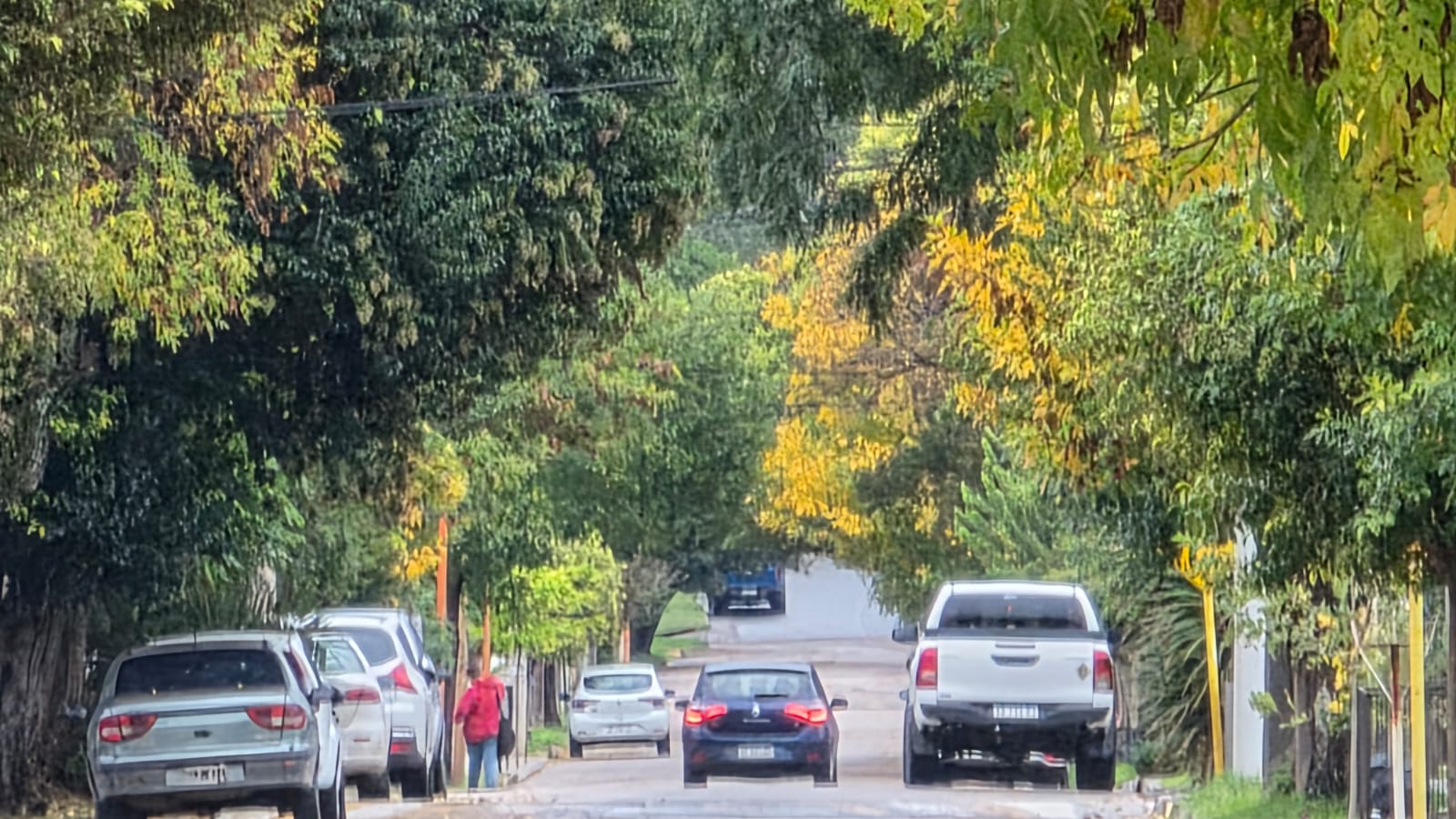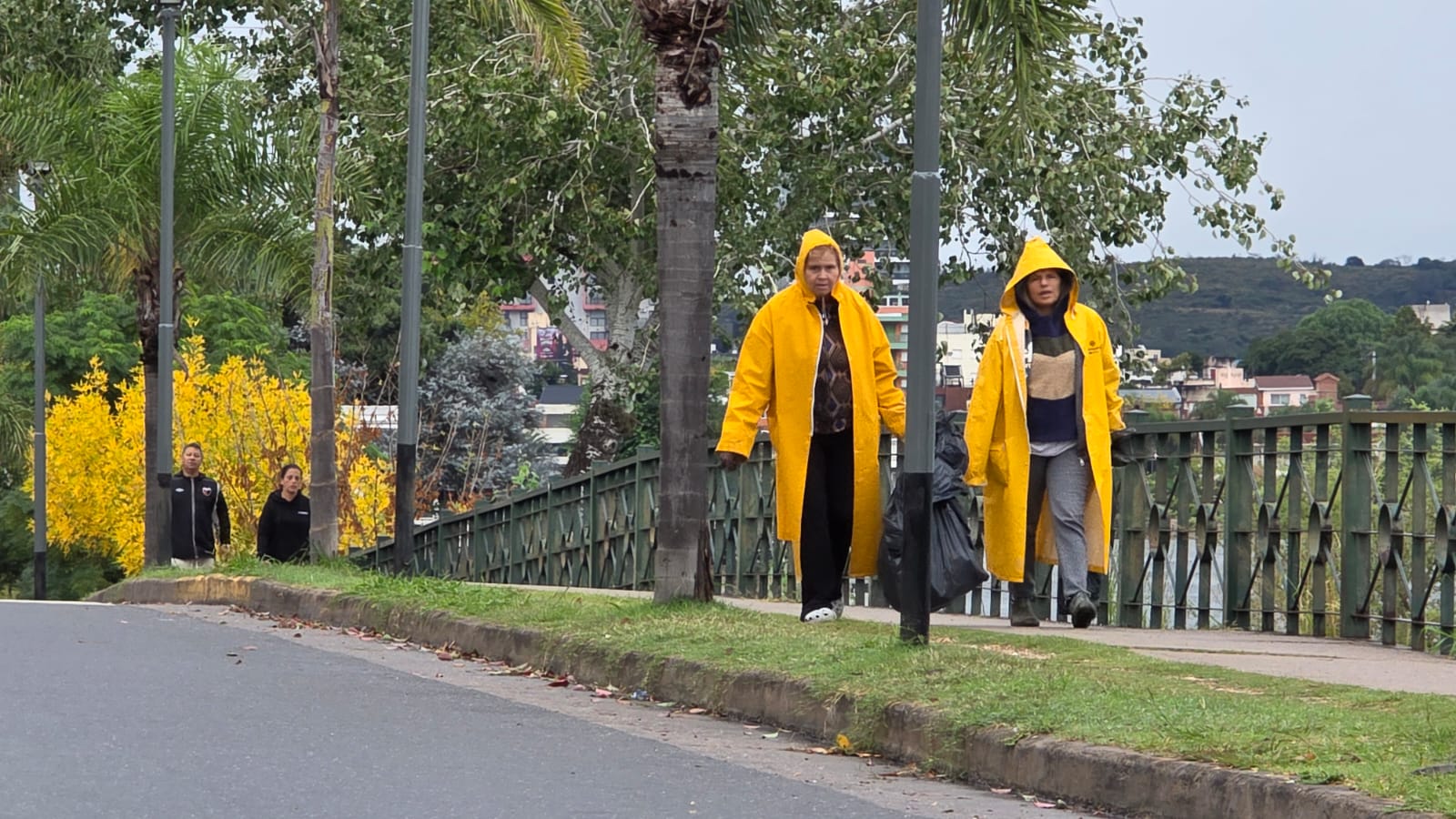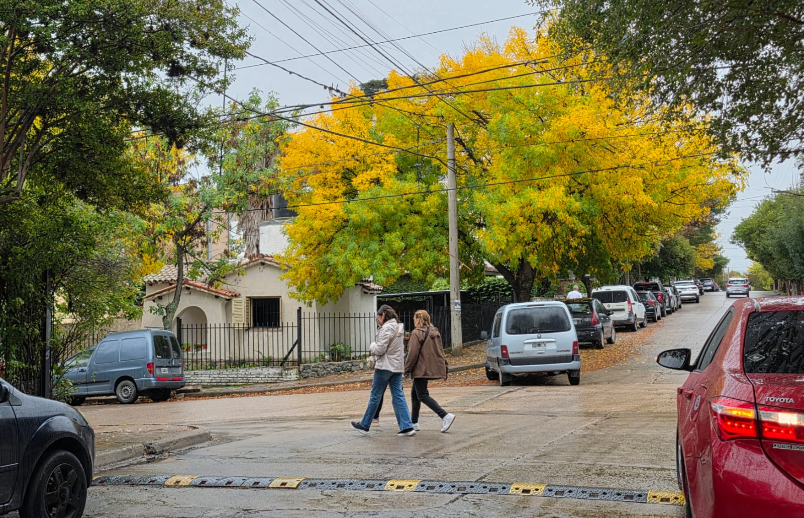 Ellas caminan con su función a cuestas. Diría que simplemente atraviesan el instante, como quien sabe que el clima también es una forma de destino. Atrás, los árboles hacen lo suyo… y más atrás todavía, la ciudad sigue, indiferente, como si nada.