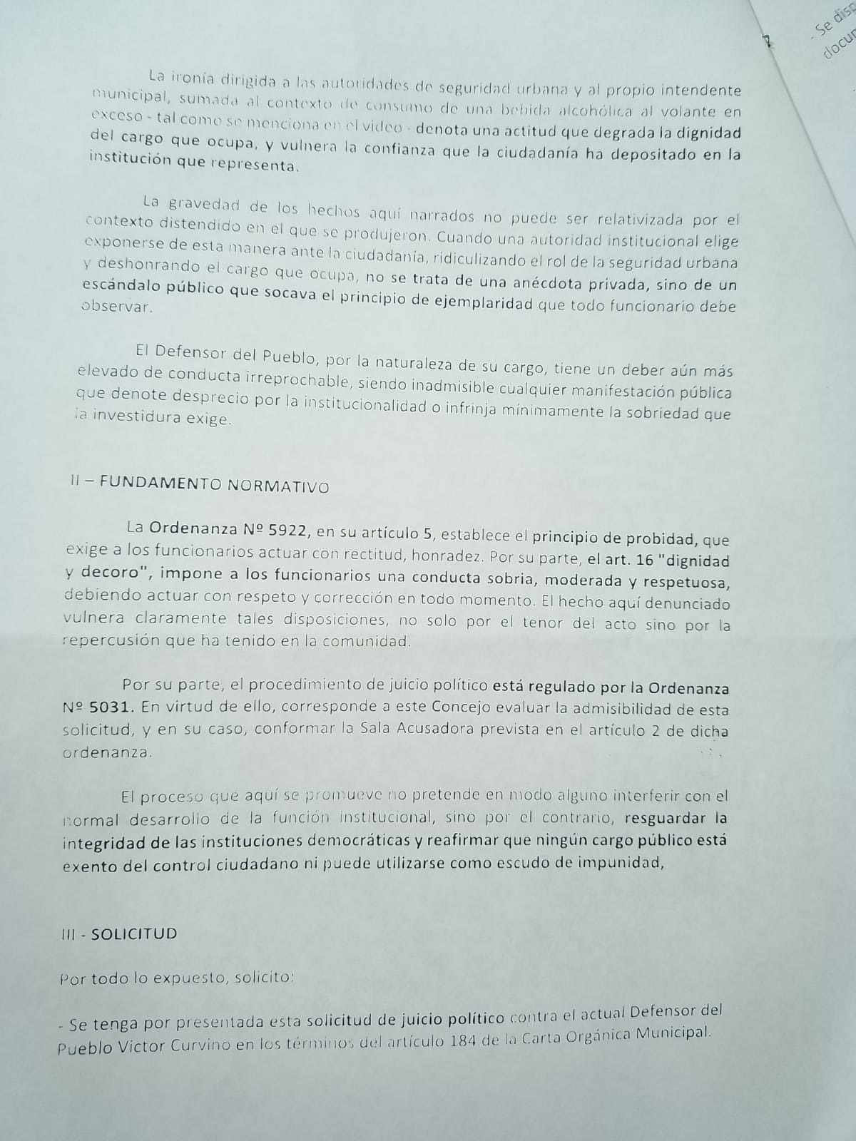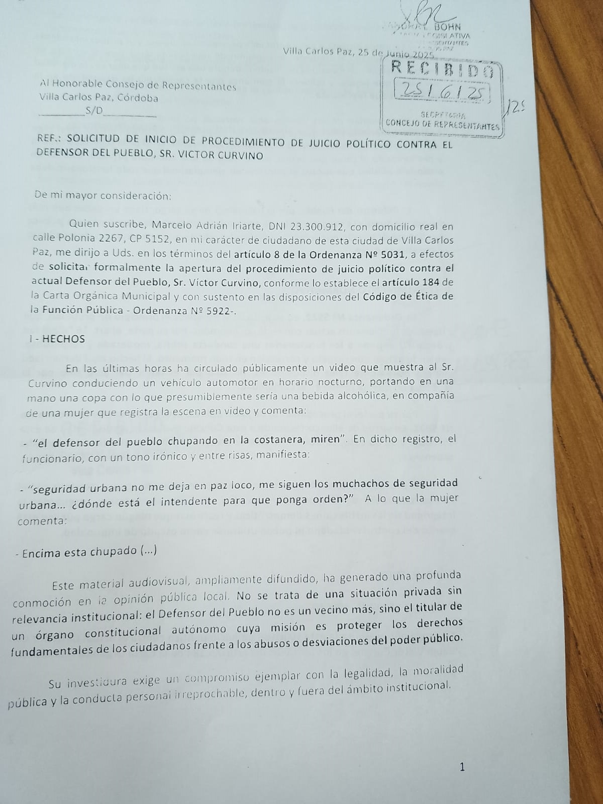 Iriarte fundamentó su pedido en la difusión de un video que muestra al actual Defensor del Pueblo, Curvino, “conduciendo un vehículo automotor en horario nocturno, portando en una mano una copa con lo que presumiblemente sería una bebida alcohólica”. La escena, registrada por una mujer que lo acompaña y que ironiza sobre la situación, fue ampliamente compartida en redes sociales y medios locales.