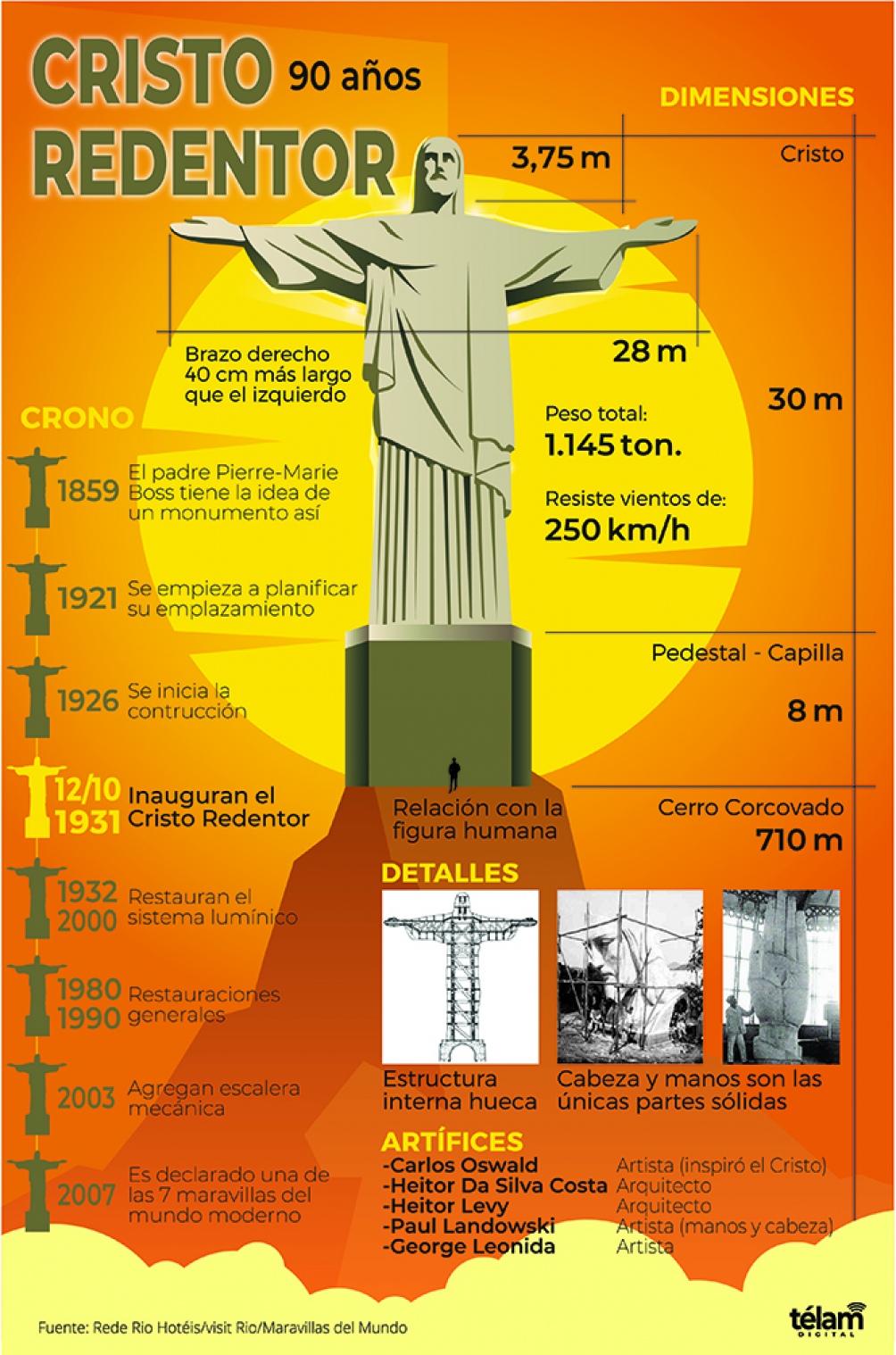 La imponente estructura recibe, desde el 12 de octubre de 1931 en lo alto del Corcovado y con los brazos abiertos en señal de abrazo fraternal, a los miles de turistas que visitan la «ciudad maravillosa».