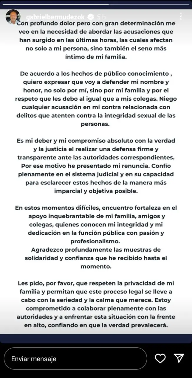 “Con profundo dolor, pero con gran determinación, me veo en la necesidad de abordar las acusaciones que han surgido en las últimas horas, las cuales afectan no sólo a mi persona, sino también el seno más íntimo de mi familia”, comenzó señalando Bermúdez.