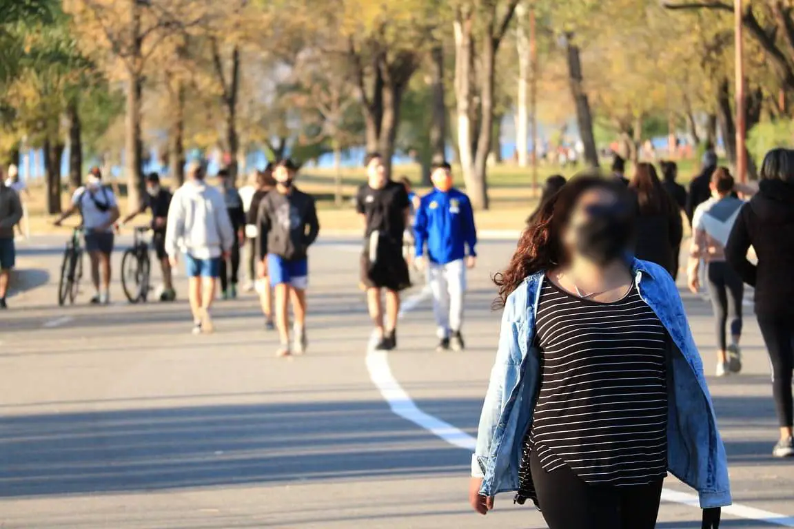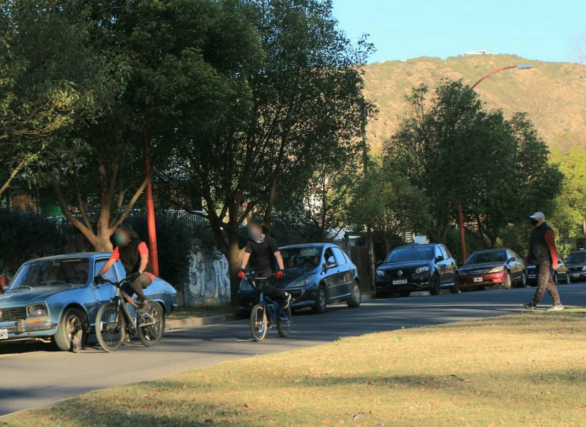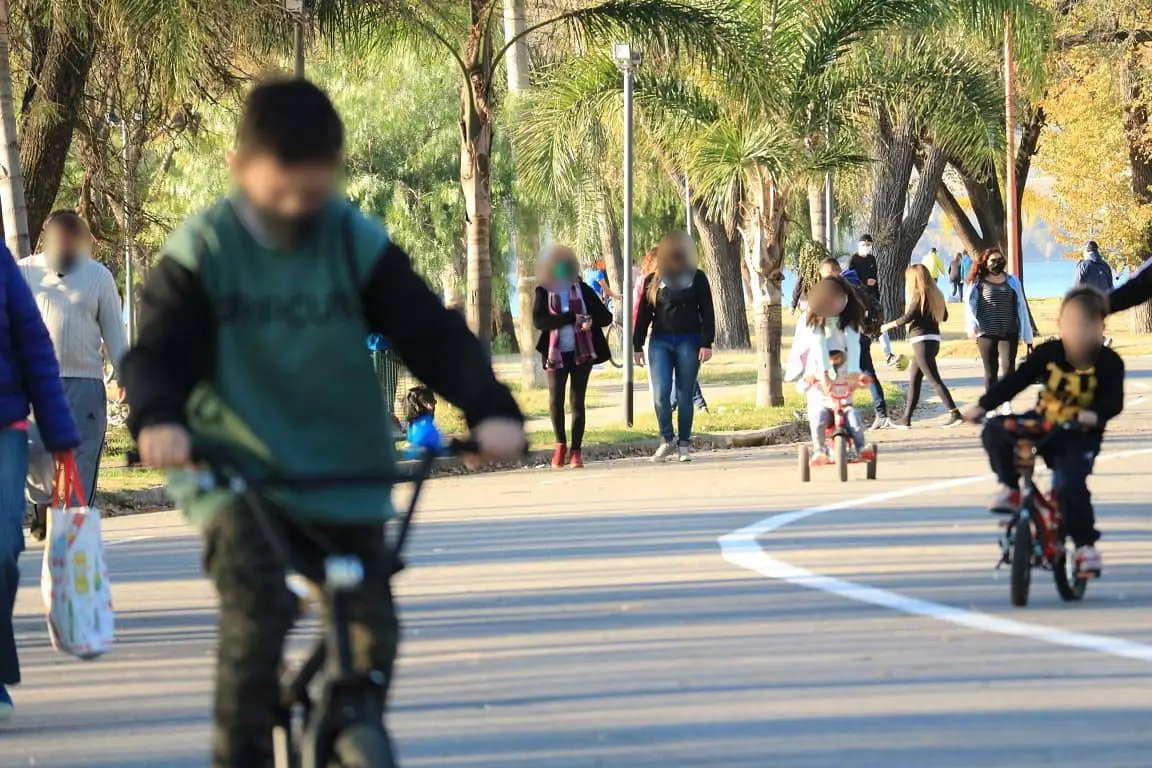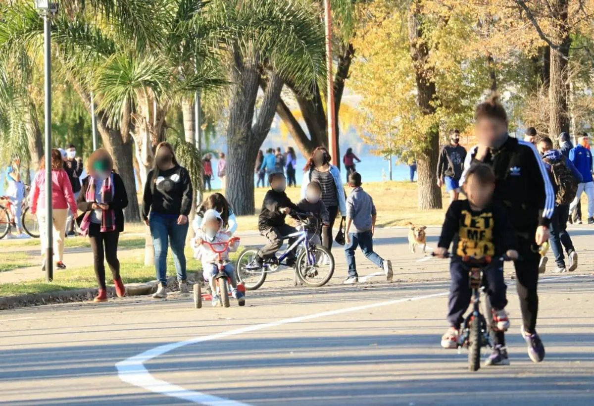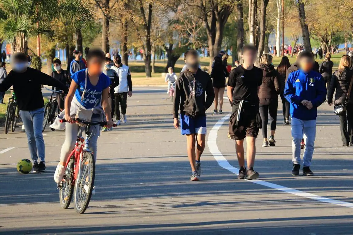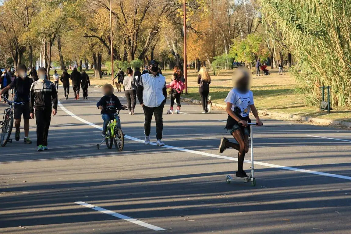 El domingo por la tarde fue el punto culmine de aglomeración de gente (todas estas fotos fueron tomadas entre las 17 y las 17:30 horas), teniendo además conductas que no respetaban días, horarios, ni normativas: Gente sentada en los bancos, utilizando las estaciones de ejercicios saludables, sentadas en la vereda de una heladería consumiendo helados, adultos andando en bici cuando el horario tope era hasta las 13hs, gente caminando sin barbijos, jugando al fútbol o incluso sin la distancia social mínima recomendada. Todo eso junto, puede observarse en las fotos.