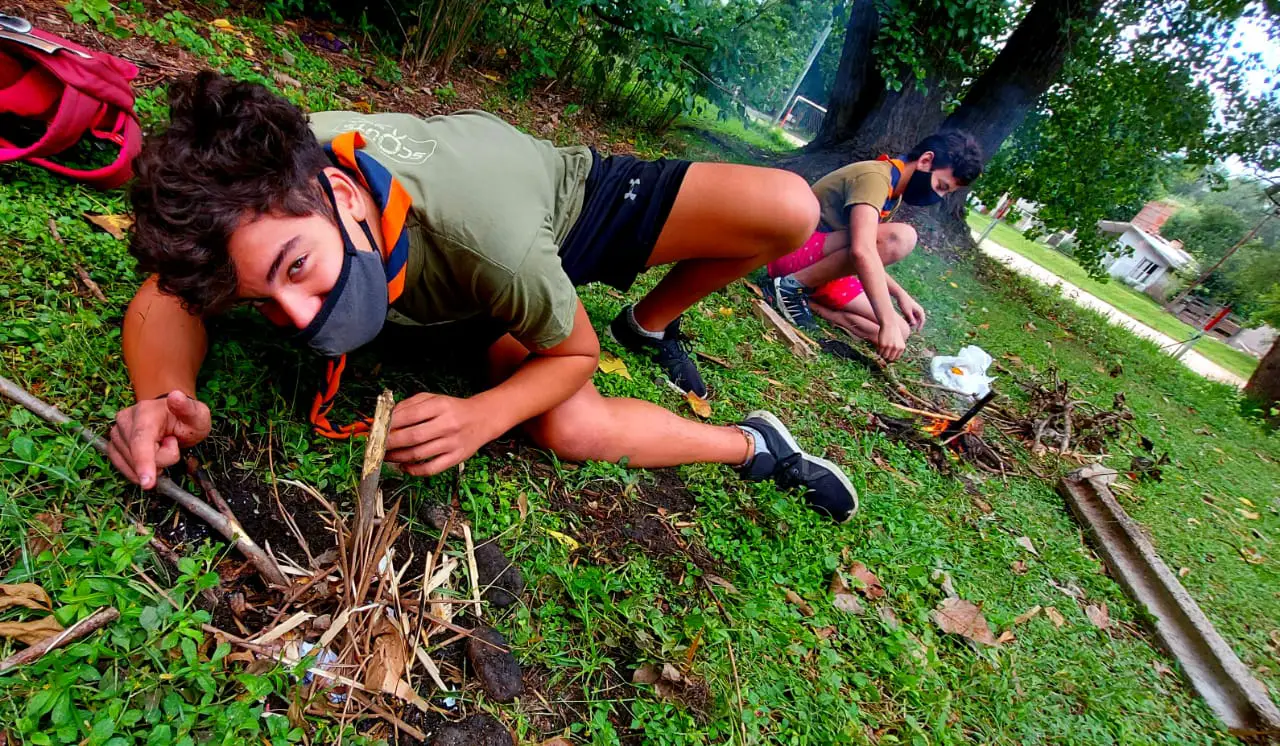 La dificultad de Teo, entre bromas, risas y barbijos, para encender el fueguito necesario para cocinar la tortilla que será el desayuno del equipo, esta filmada y será parte de EncuentroS esta semana… mas allá de las cargadas lógicas del caso.