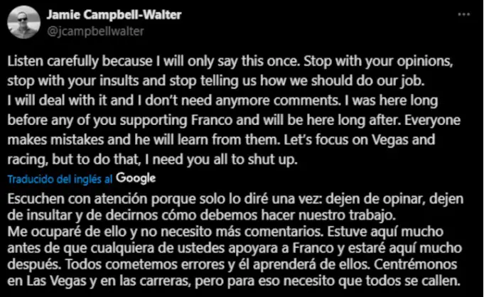 Jamie Campbell-Walter escribió en su cuenta oficial de Twitter: “Escuchen con atención porque solo lo diré una vez: dejen de opinar, dejen de insultar y de decirnos cómo debemos hacer nuestro trabajo. Me ocuparé de ello y no necesito más comentarios. Estuve aquí mucho antes de que cualquiera de ustedes apoyara a Franco y estaré aquí mucho después. Todos cometemos errores y él aprenderá de ellos. Centrémonos en Las Vegas y en las carreras, pero para eso necesito que todos se callen”.