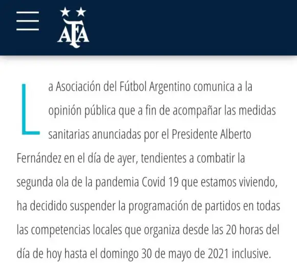 Luego del anuncio del Presidente Alberto Fernández, la Asociación del Fútbol Argentino emitió un comunicado donde expresa la suspensión de todas las competencias organizadas por la entidad. Por ahora, los encuentros por Copa Libertadores se jugarán.