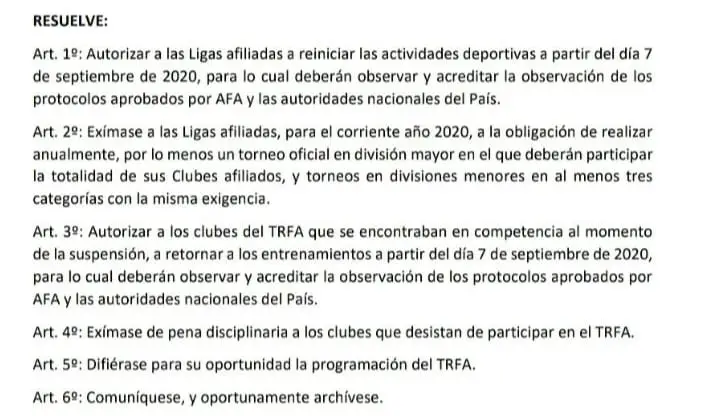 La fecha indicada por el Consejo Federal de la Asociación del Fútbol Argentino es el 7 de septiembre para todas las ligas afiliadas, por lo cual deberán acreditar la observación de los protocolos aprobados por AFA y las autoridades nacionales del País.