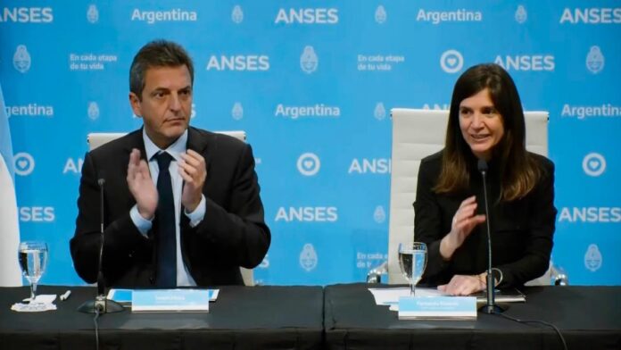 El ministro de Economía, Sergio Massa y la directora ejecutiva de Anses, Fernanda Raverta, anunciaron este martes nuevos créditos de ese organismo de hasta $400.000 para jubilados y pensionados, con una Tasa Nominal Actual (TNA) del 29%, la más baja del mercado, en un acto realizado en la sede central del organismo.