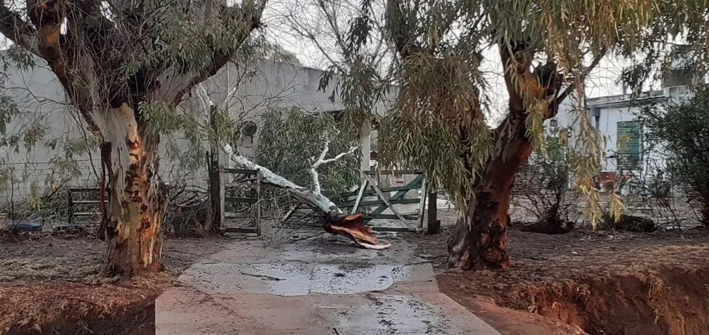 Pasadas las 17 horas se registraron fuertes vientos y caída de granizo, lo que provocó la caída de ramas, y la voladura del techo de una vivienda en construcción.