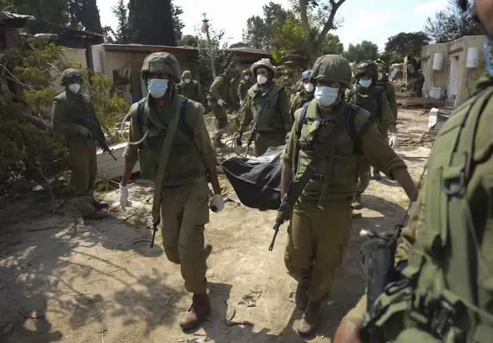 Cadáveres de residentes israelíes y militantes de Hamás yacían en los terrenos del kibutz de Kfar Aza en medio de casas quemadas, muebles esparcidos y autos incendiados, cuando soldados israelíes iban de casa en casa para llevarse a los muertos.