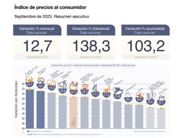 De esta forma, el Índice de Precios al Consumidor (IPC) acumula un incremento interanual de 138,3% y de 103,2% en los primeros nueve meses del corriente año.
