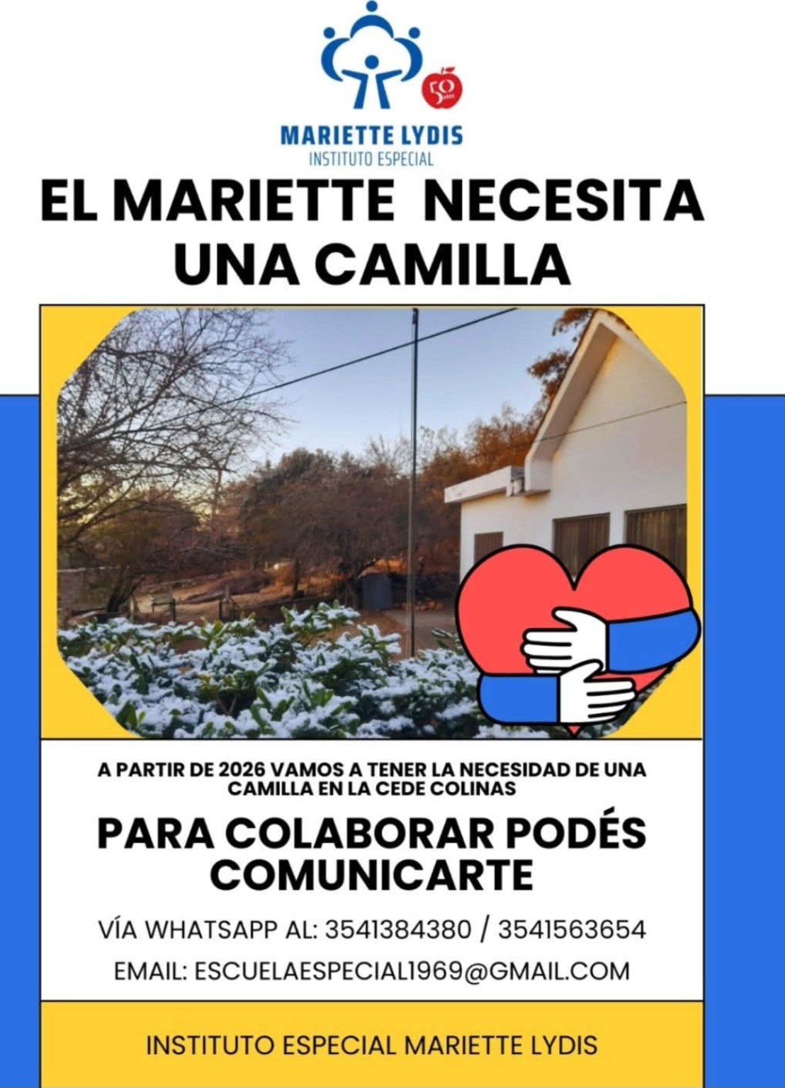 A pocos días del inicio del ciclo lectivo 2026, el Instituto Especial Mariette Lydis puso en marcha una campaña solidaria para conseguir una camilla destinada a su sede de barrio Colinas. La necesidad es concreta, urgente y responde a un cambio en la población de estudiantes que requieren asistencia específica.