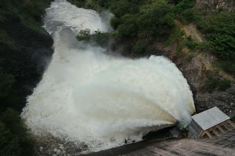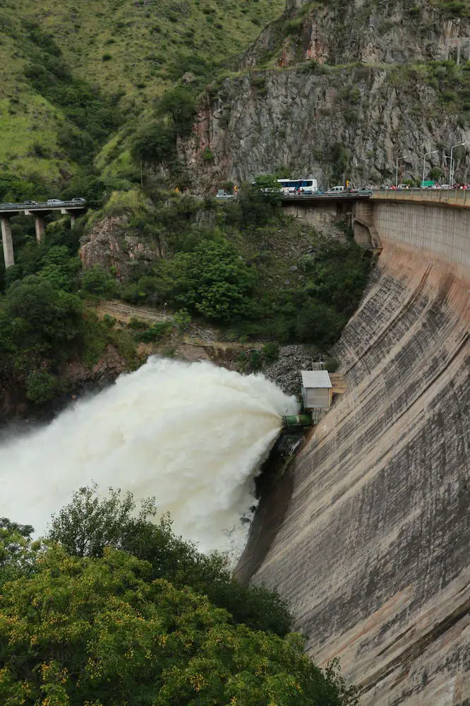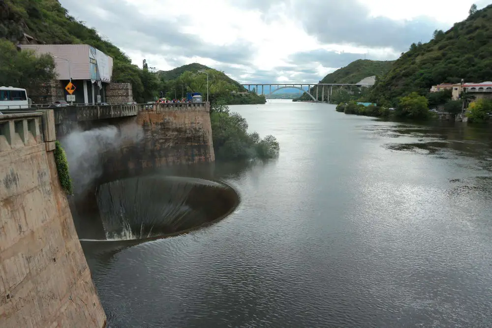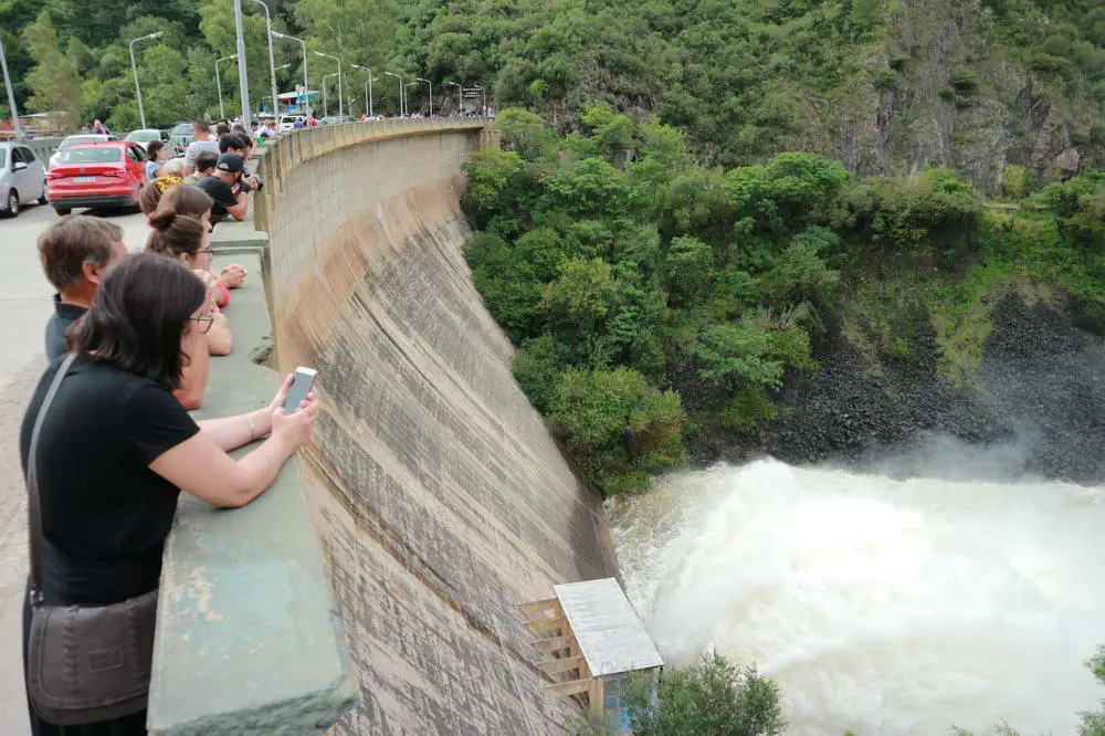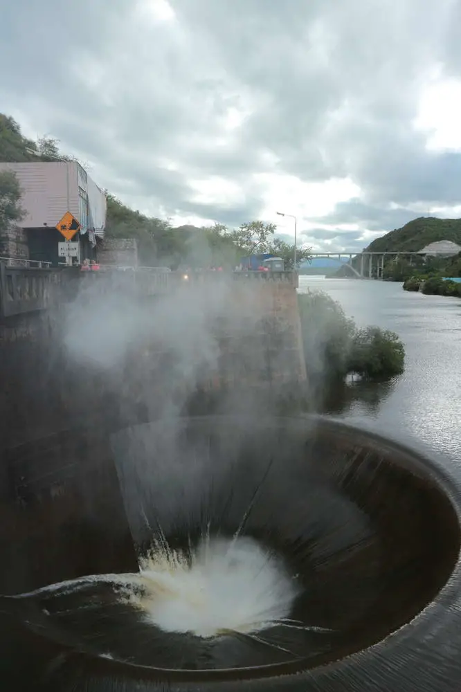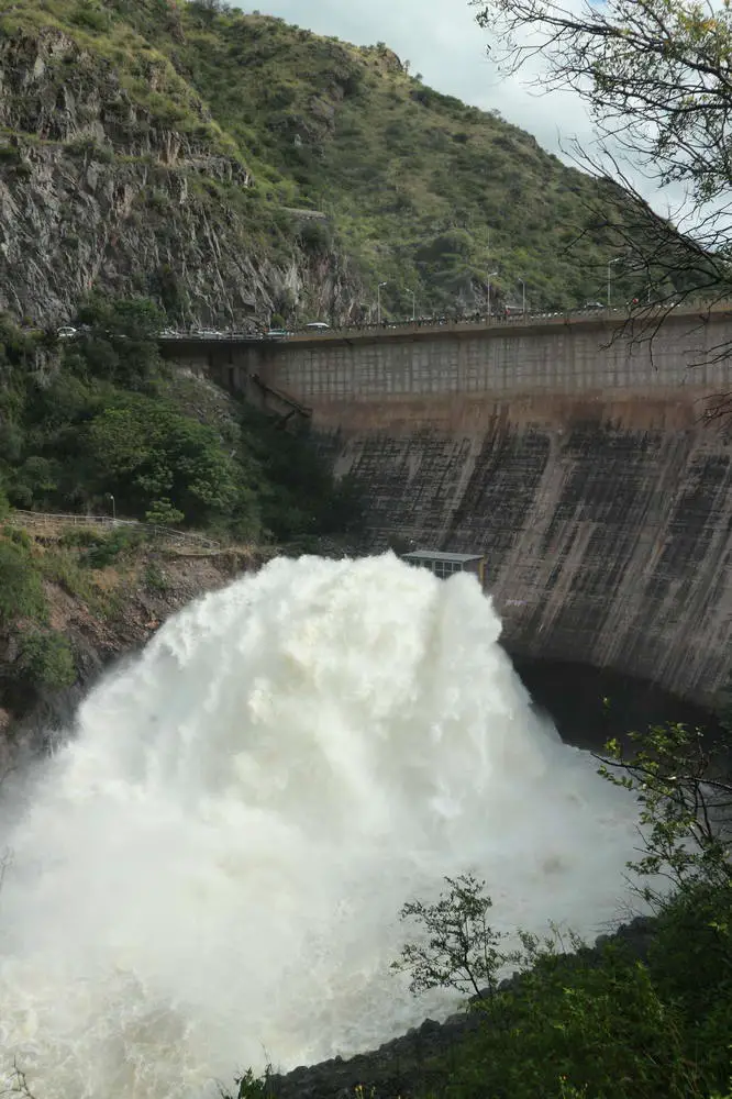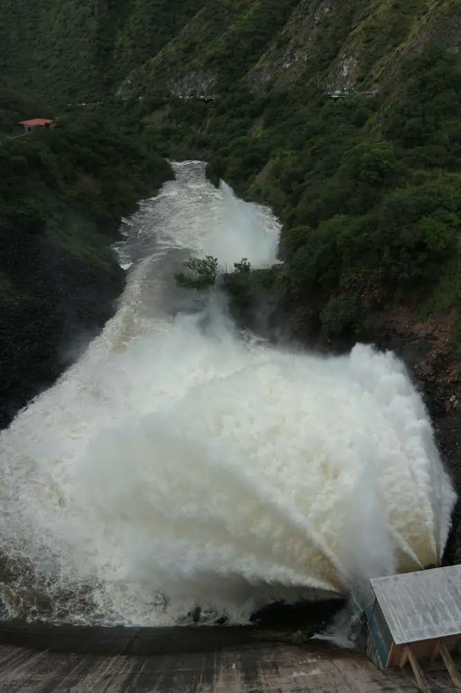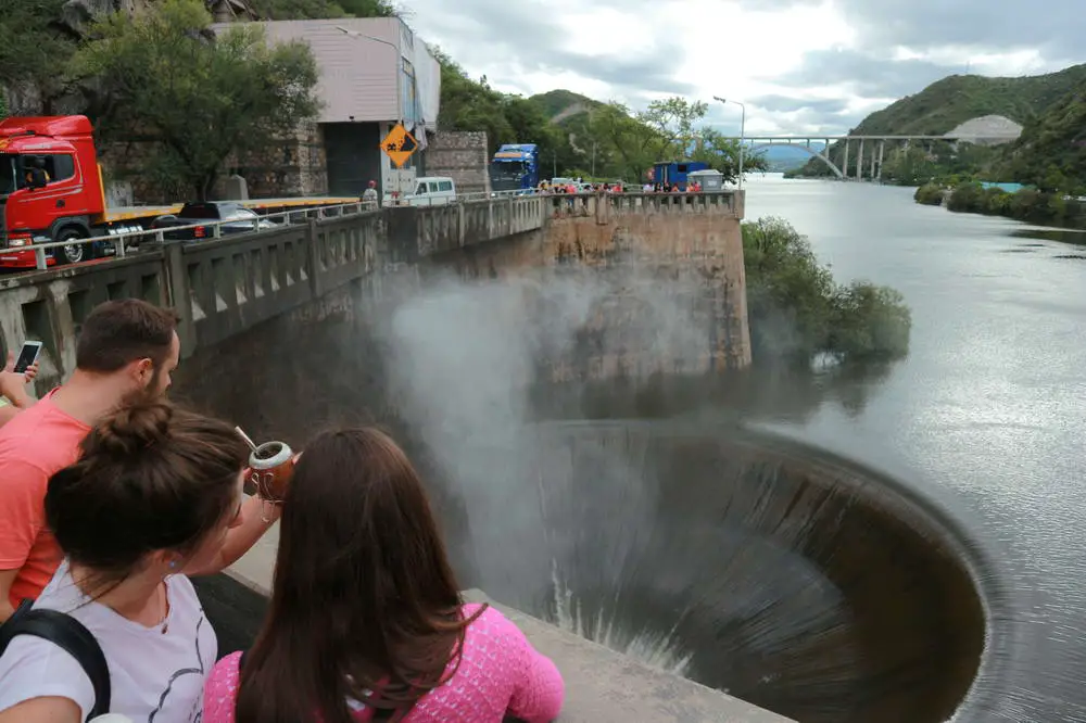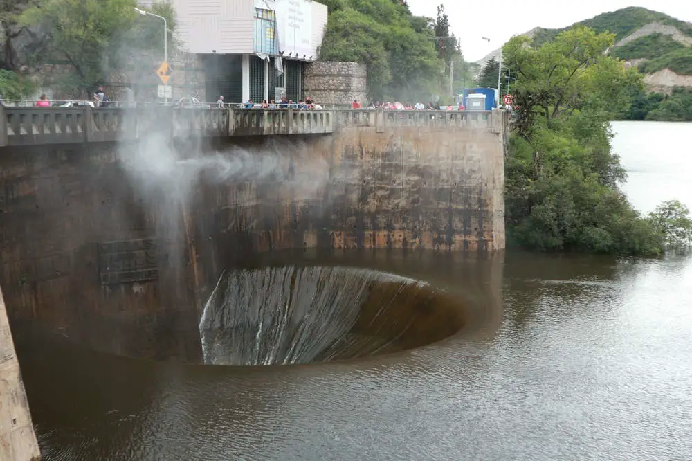 La caída de agua a través del embudo y la “cola de la novia” producida por la apertura de las válvulas del dique (una al 100% y la otra al 50%) se volvieron un espectáculo para los visitantes en el paredón San Roque.