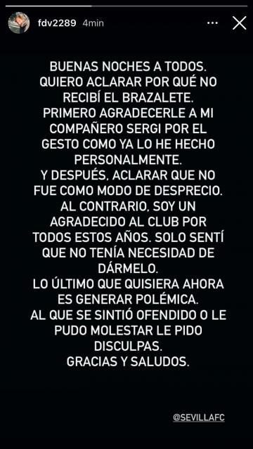 Por la Copa del Rey, Sevilla le ganó 2-0 como visitante a Linares (equipo de Segunda B) y Franco Vázquez disputó los últimos 15 minutos del encuentro. Sin embargo, se instaló un debate en las redes sociales donde indicaban que el “Mudo” despreció la cinta de capitán que le ofreció Sergi al momento del ingreso por Munir El Haddadi.