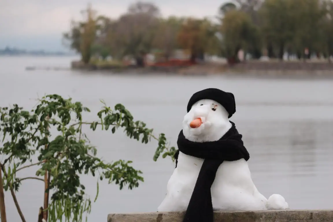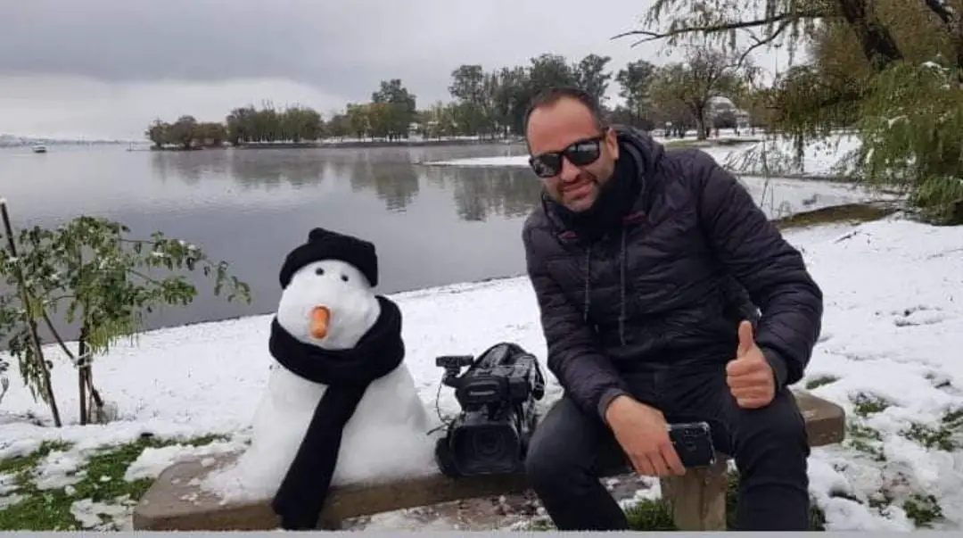 Está solito, sentado en un banco en la Bahía del Gitano. Y este miércoles en que Carlos Paz y buena parte de Córdoba amanecieron nevados, se convirtió en el protagonista de todas las fotos y selfies en la Costanera de Carlos Paz.